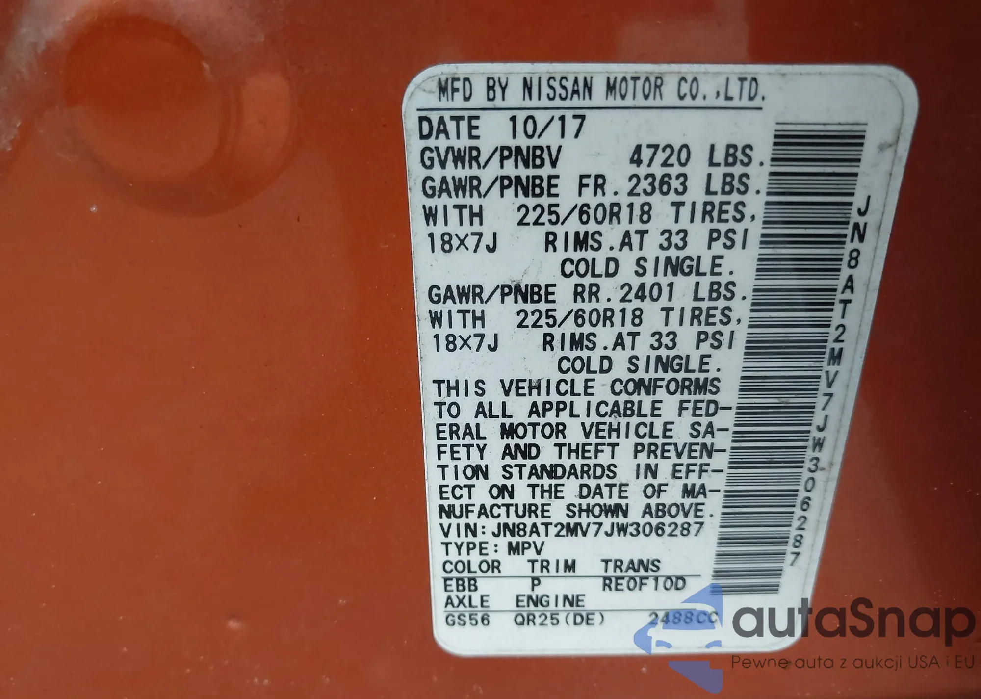 LOT: 38334092 VIN: JN8AT2MV7JW306287