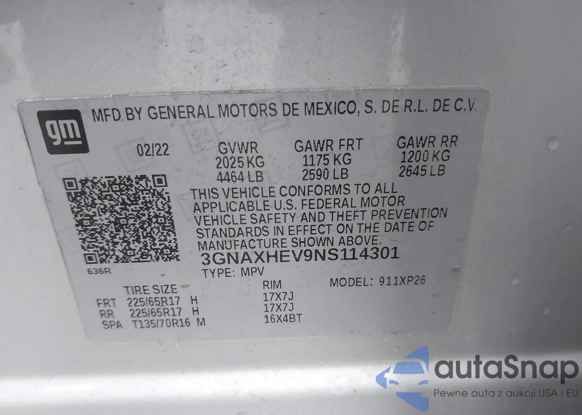 LOT: 41890422 VIN: 3GNAXHEV9NS114301