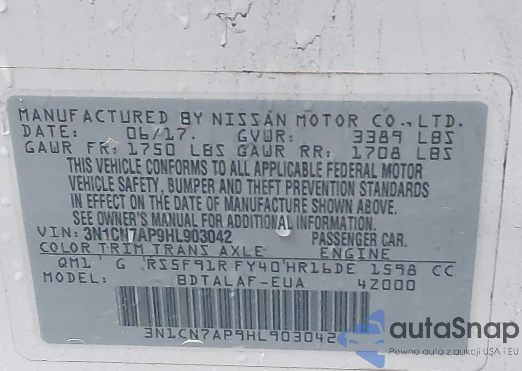 • VIN 3N1CN7AP9HL903042