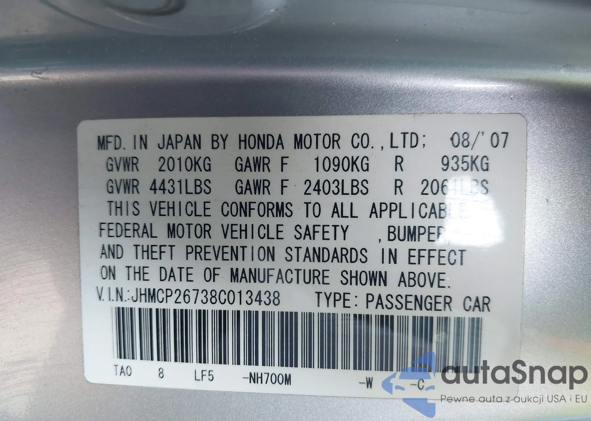 LOT: 42207378 VIN: JHMCP26738C013438