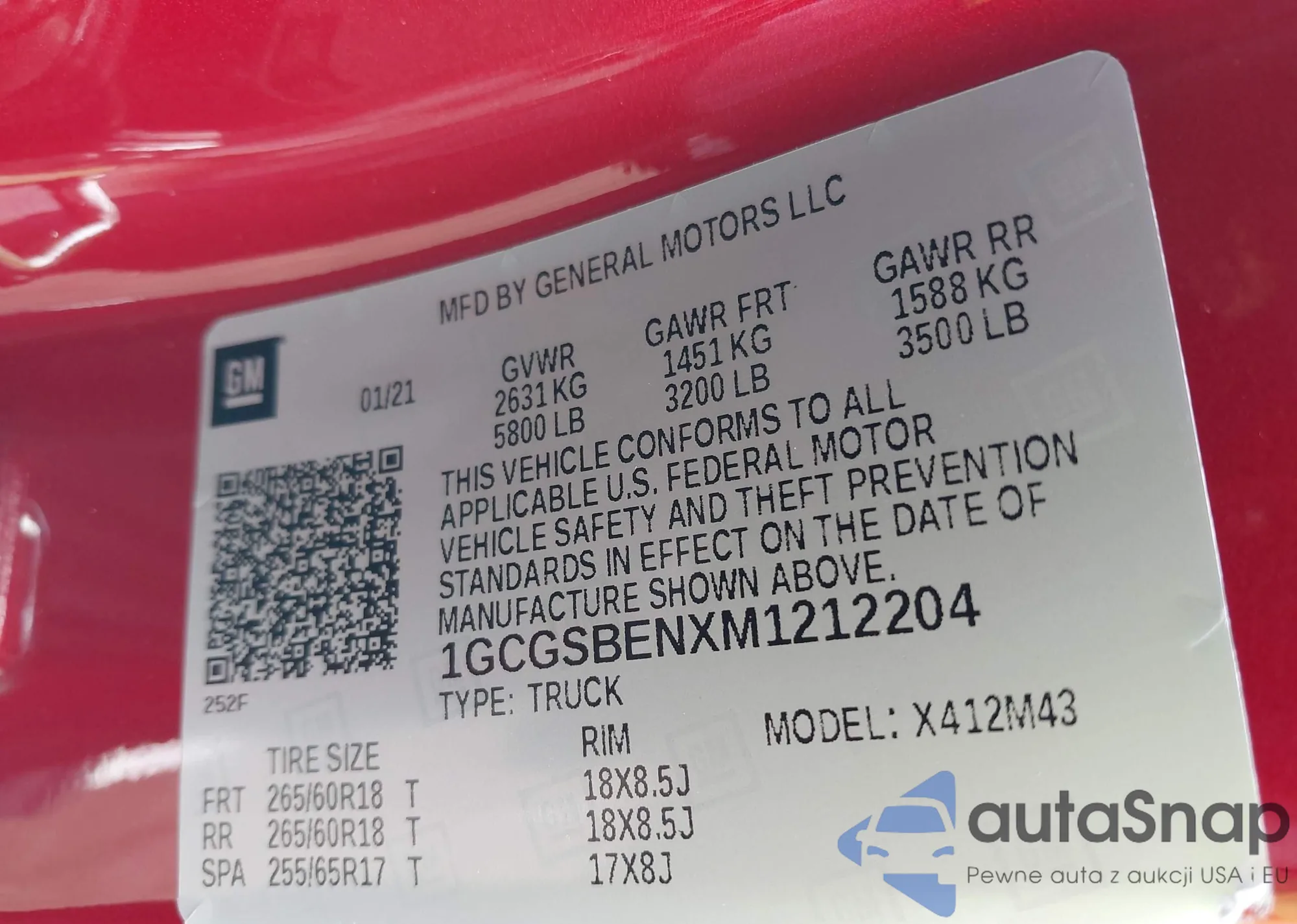 LOT: 41913861 VIN: 1GCGSBENXM1212204