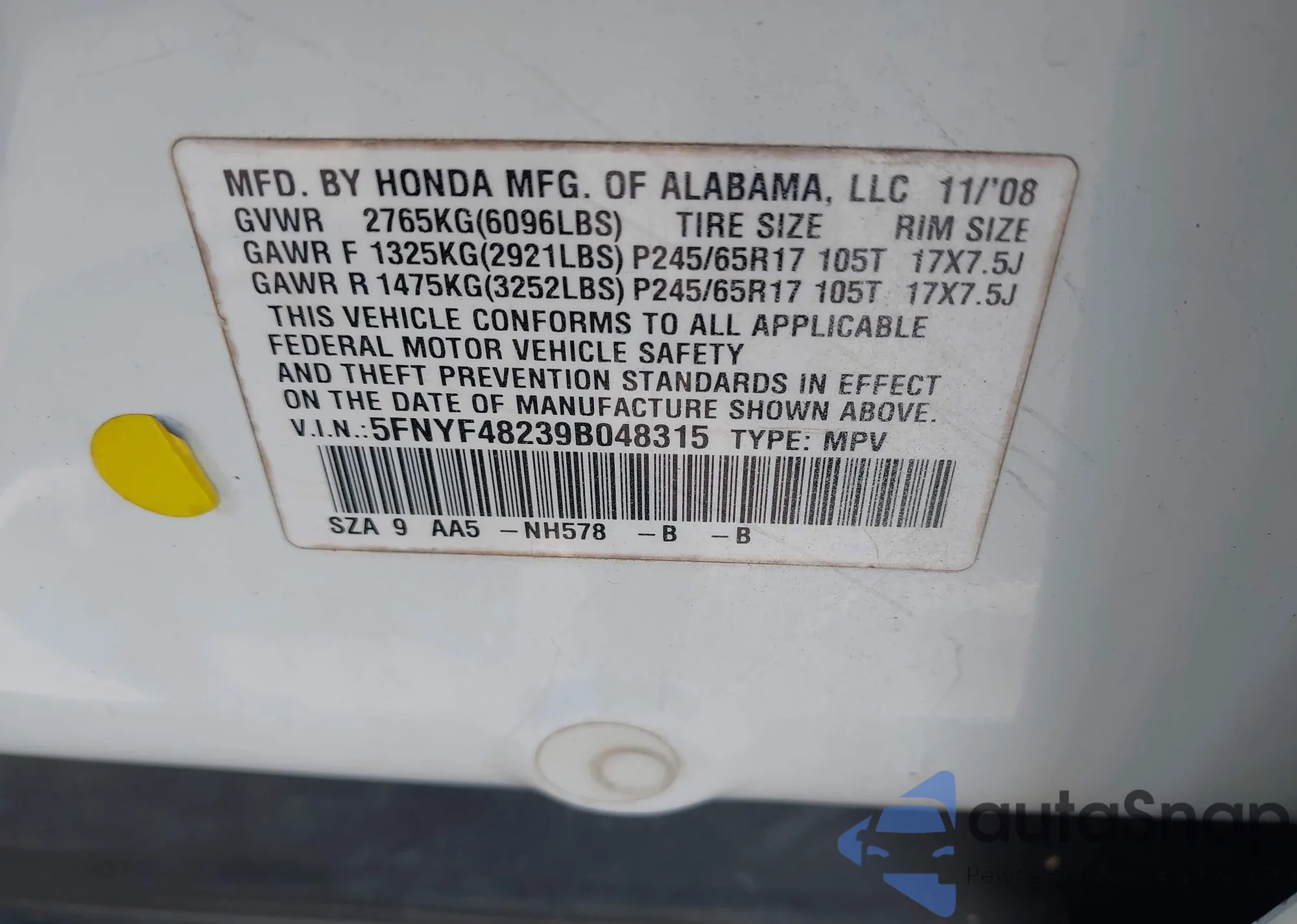 LOT: 42351716 VIN: 5FNYF48239B048315