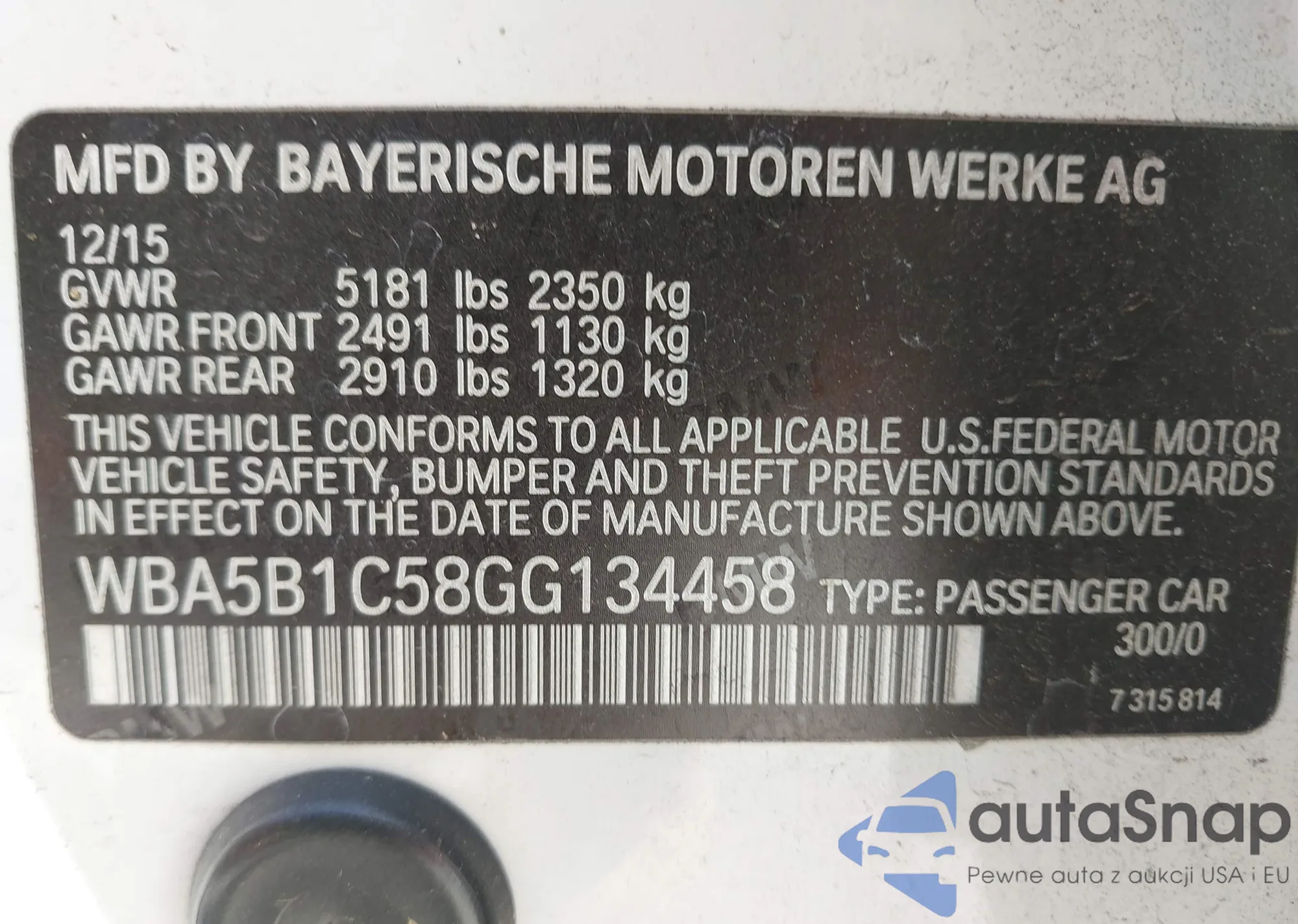 LOT: 41964735 VIN: WBA5B1C58GG134458