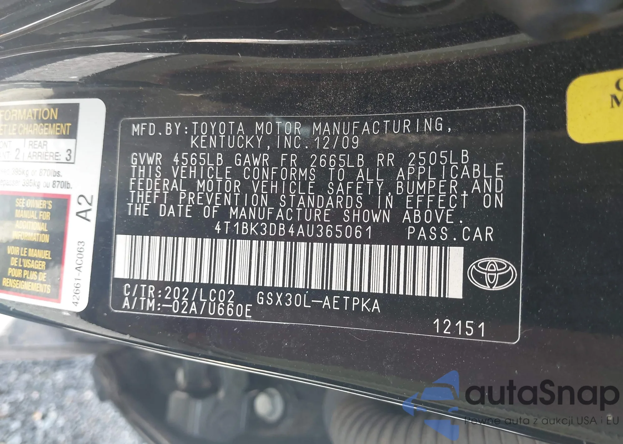 • VIN 4T1BK3DB4AU365061