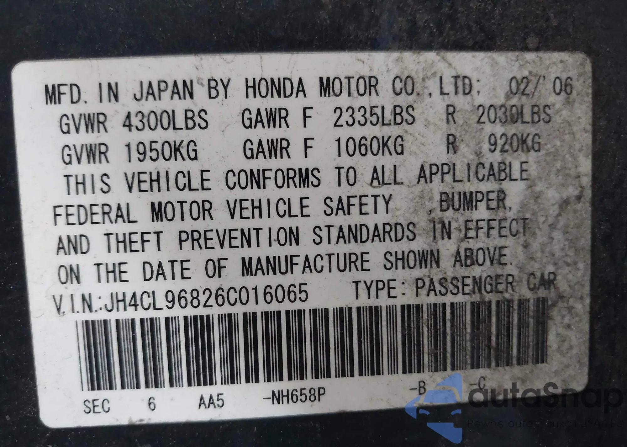 LOT: 42287214 VIN: JH4CL96826C016065