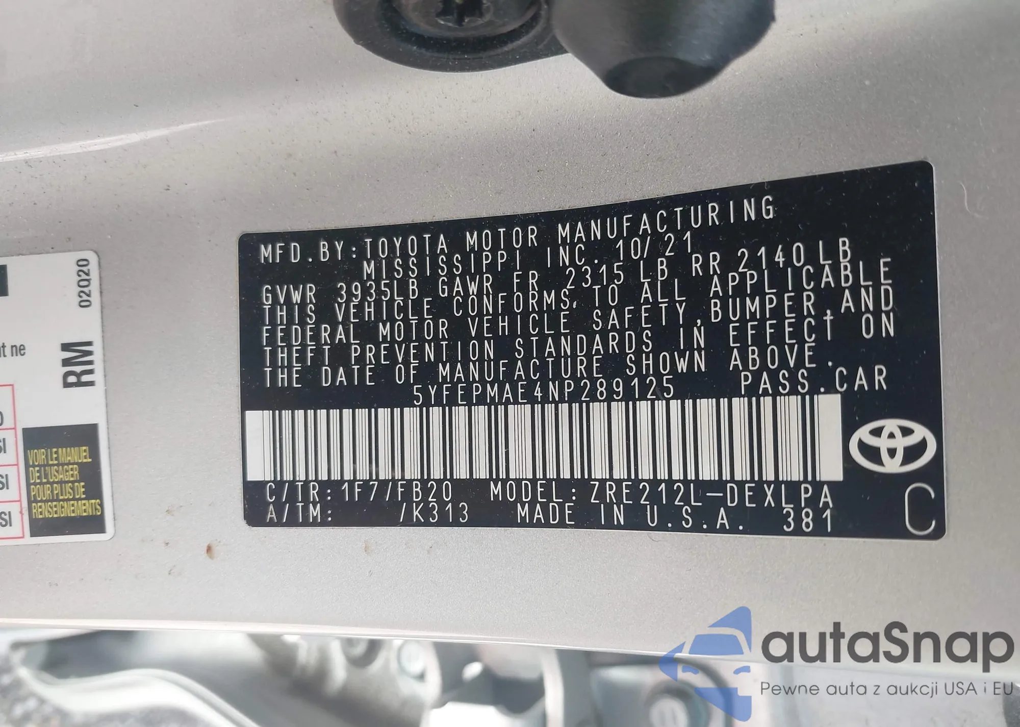 • VIN 5YFEPMAE4NP289125