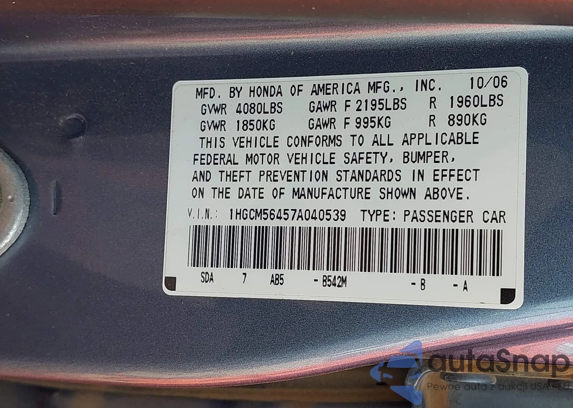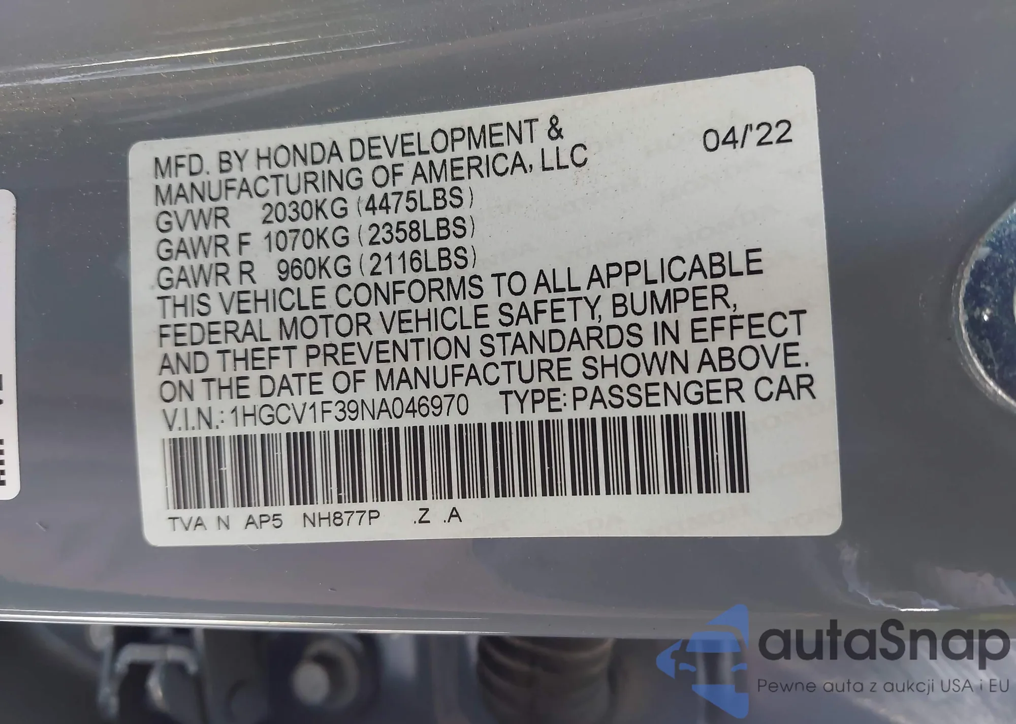 • VIN 1HGCV1F39NA046970