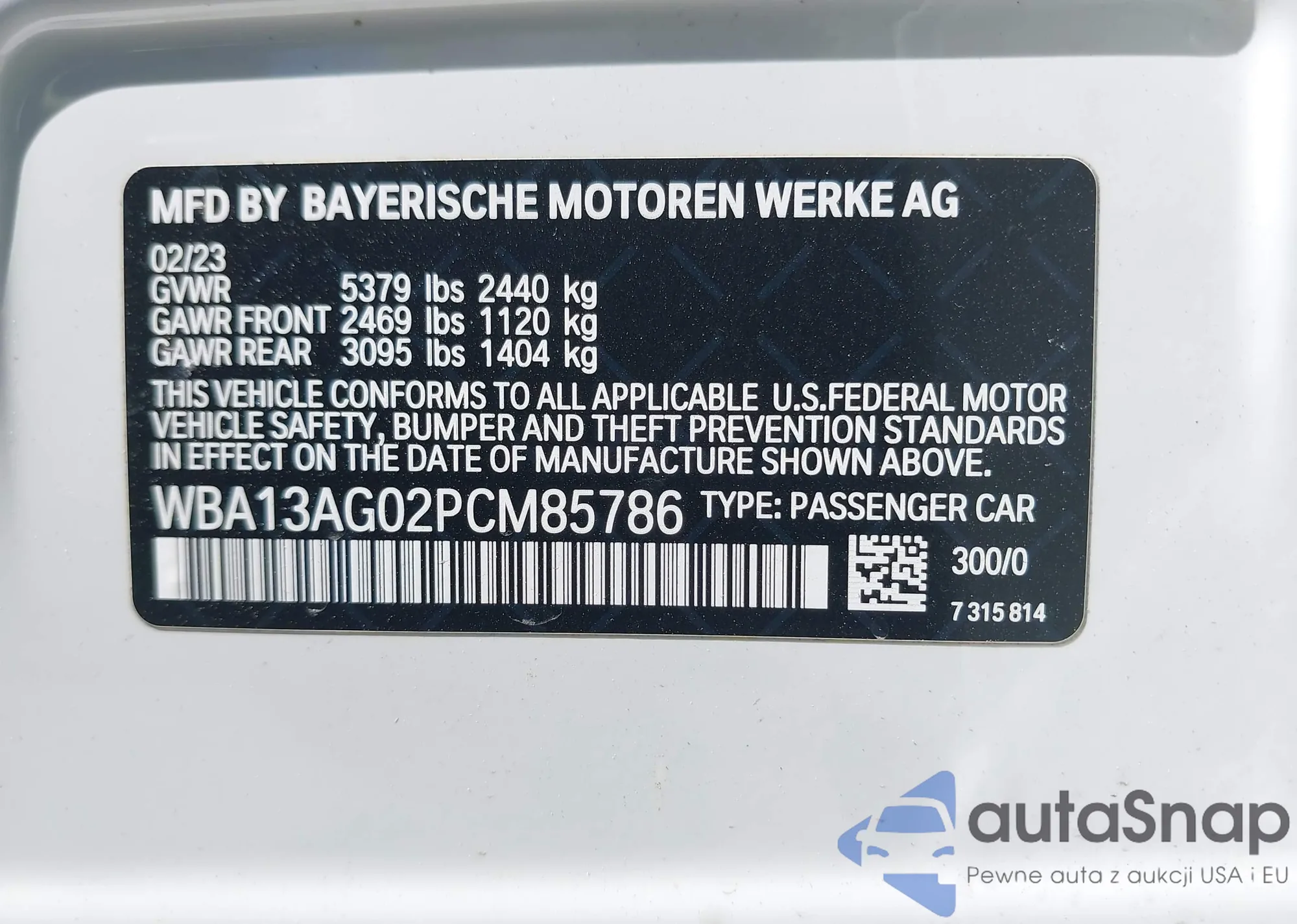 • VIN WBA13AG02PCM85786