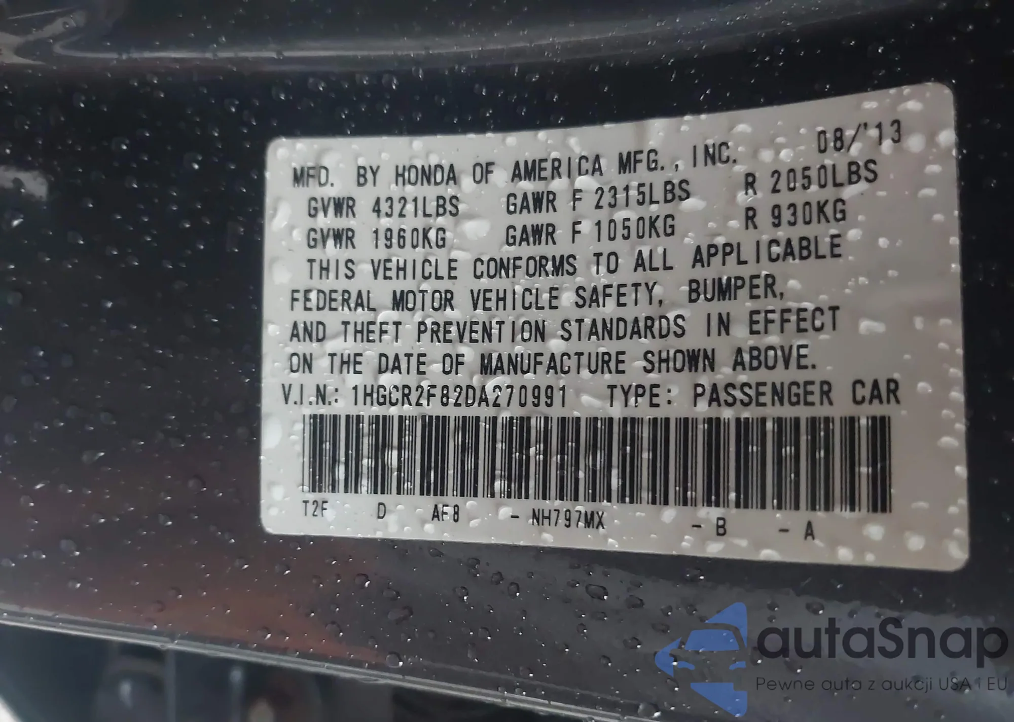 • VIN 1HGCR2F82DA270991