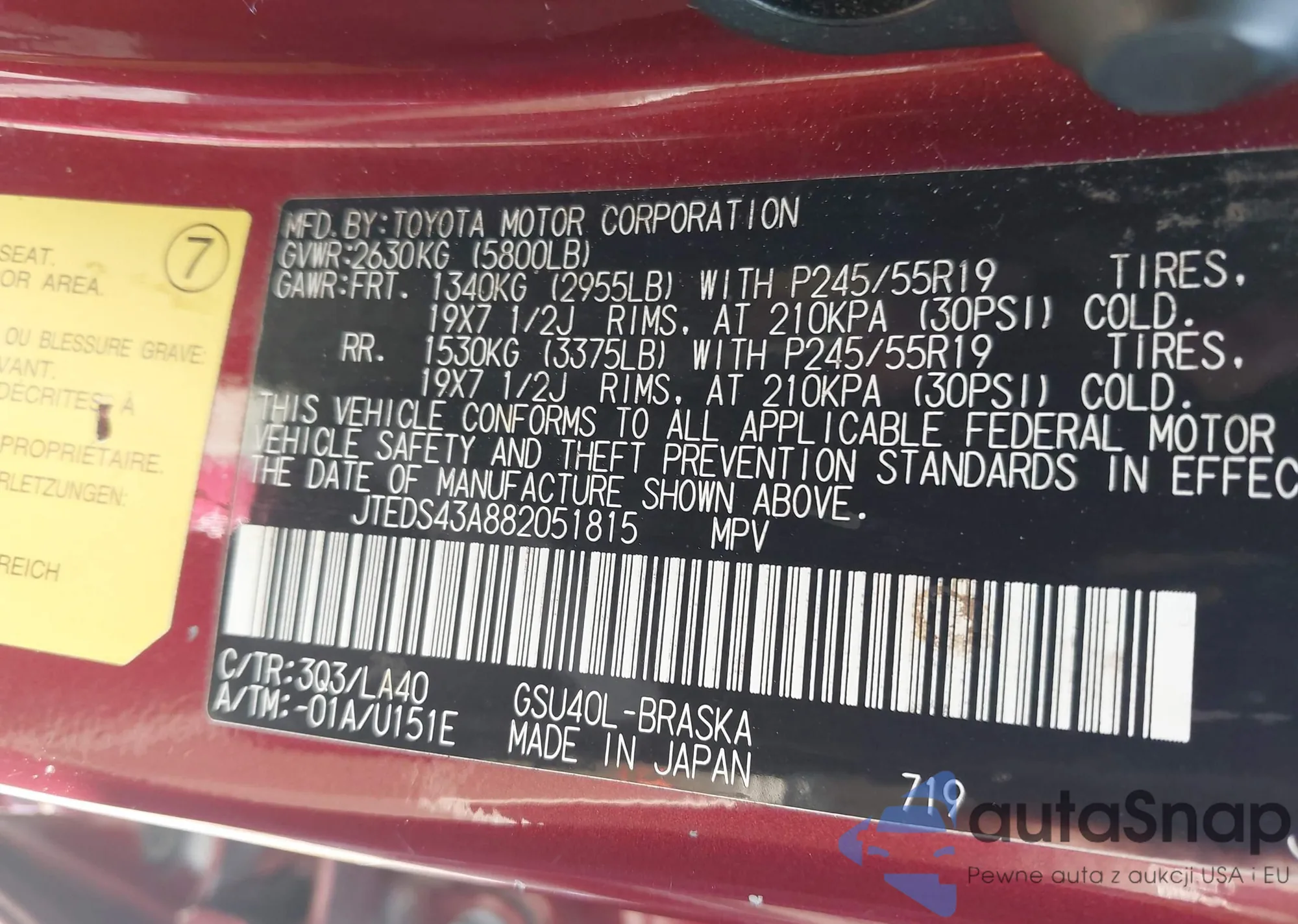 LOT: 42136045 VIN: JTEDS43A882051815