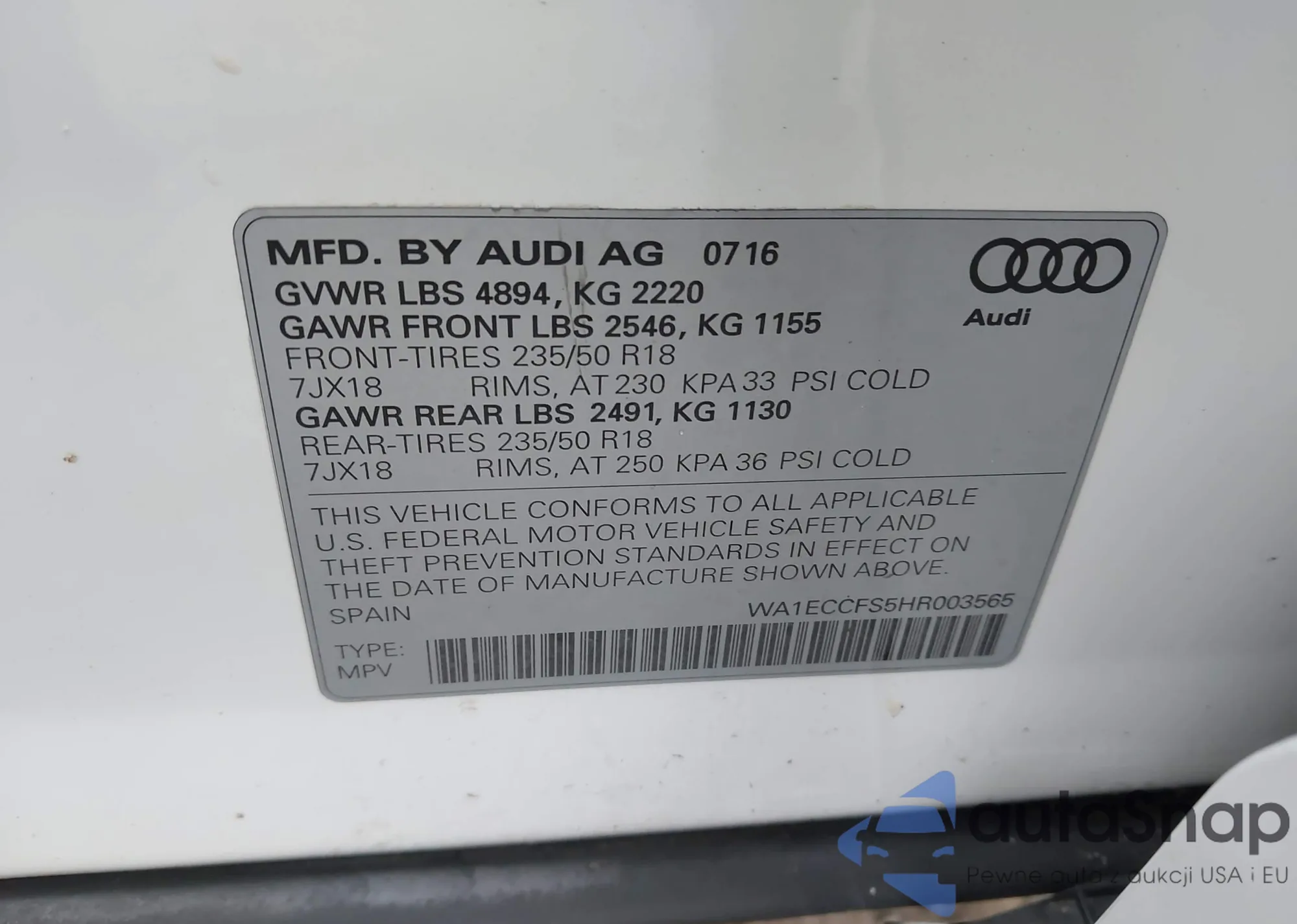 LOT: 42140711 VIN: WA1ECCFS5HR003565