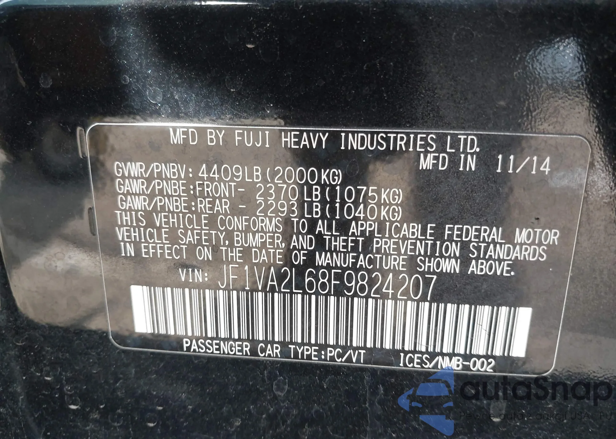 LOT: 41637409 VIN: JF1VA2L68F9824207