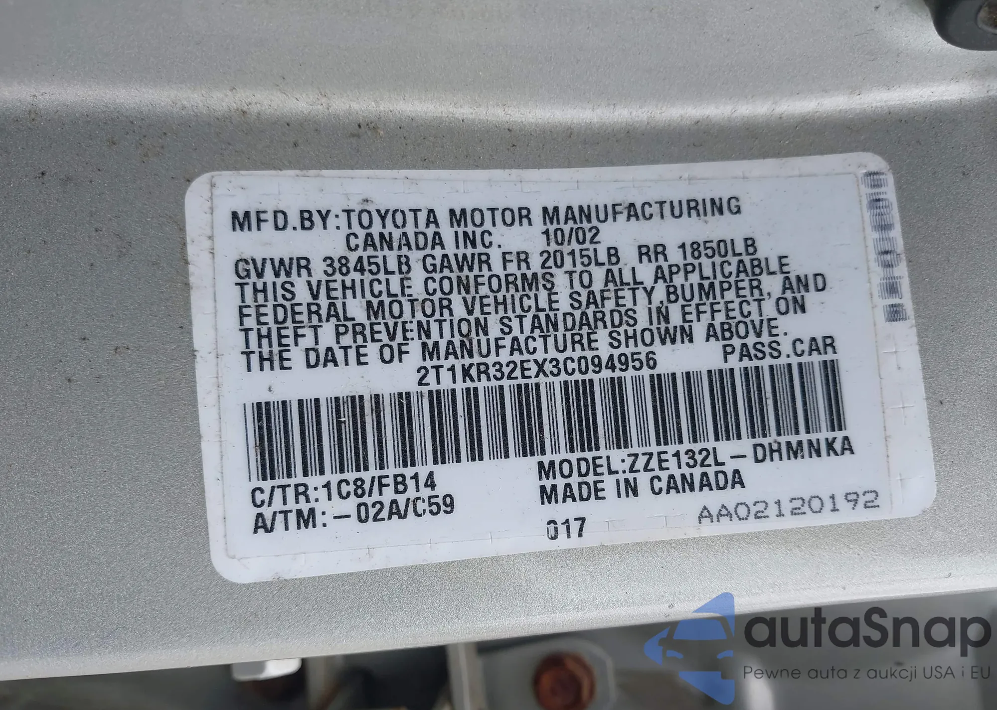 • VIN 2T1KR32EX3C094956