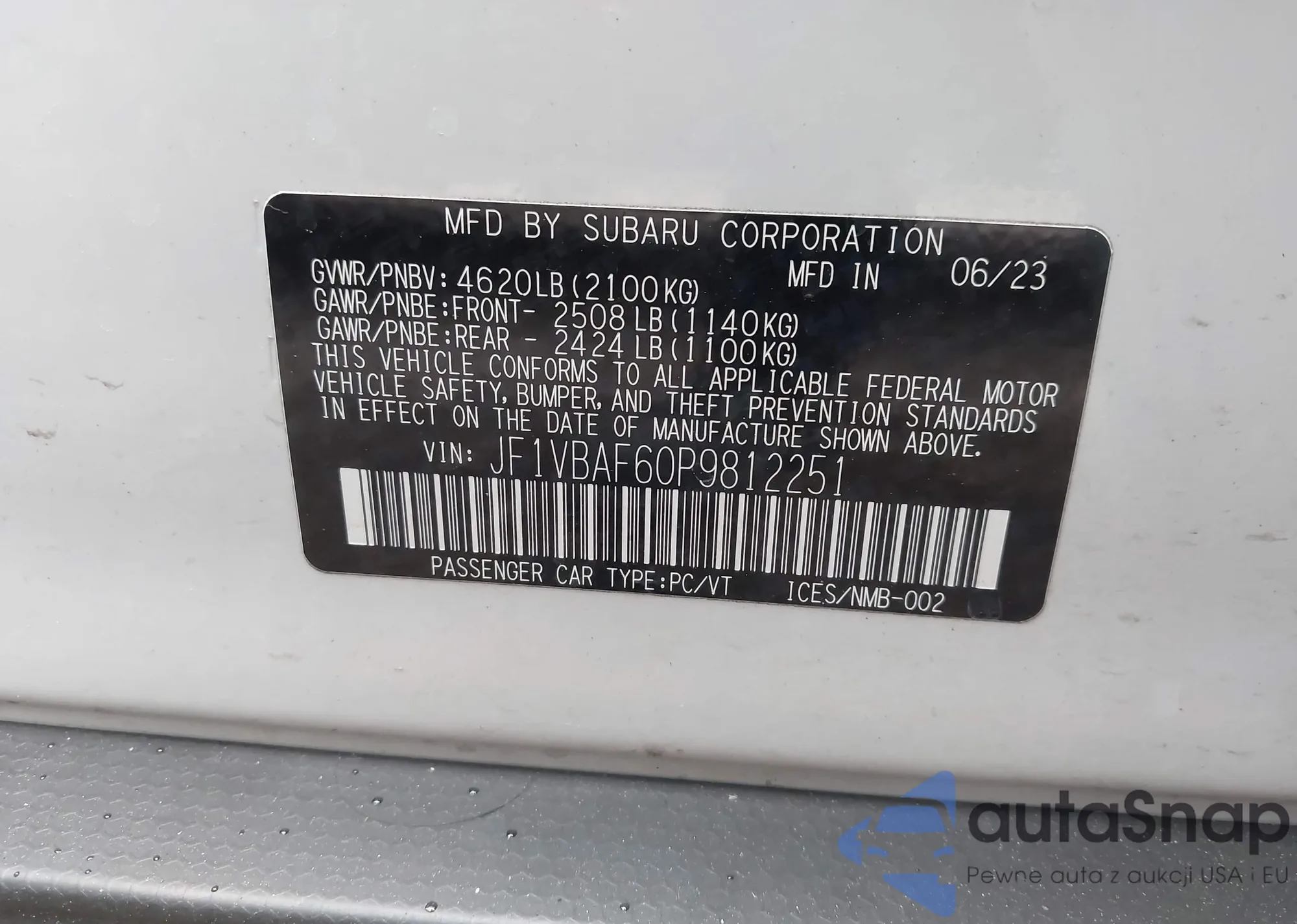 LOT: 42337606 VIN: JF1VBAF60P9812251