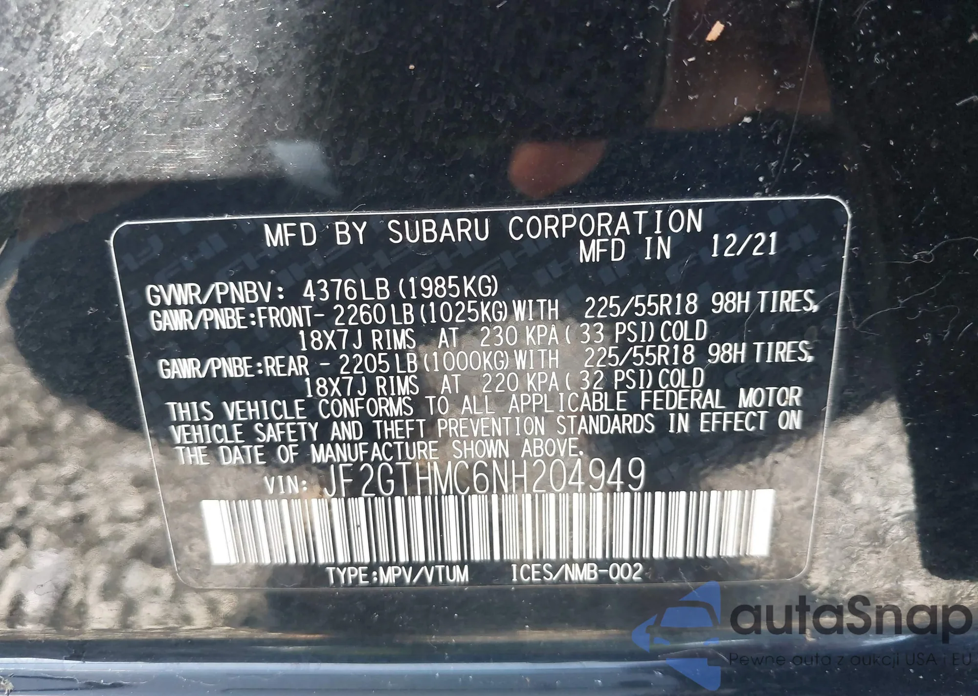 • VIN JF2GTHMC6NH204949