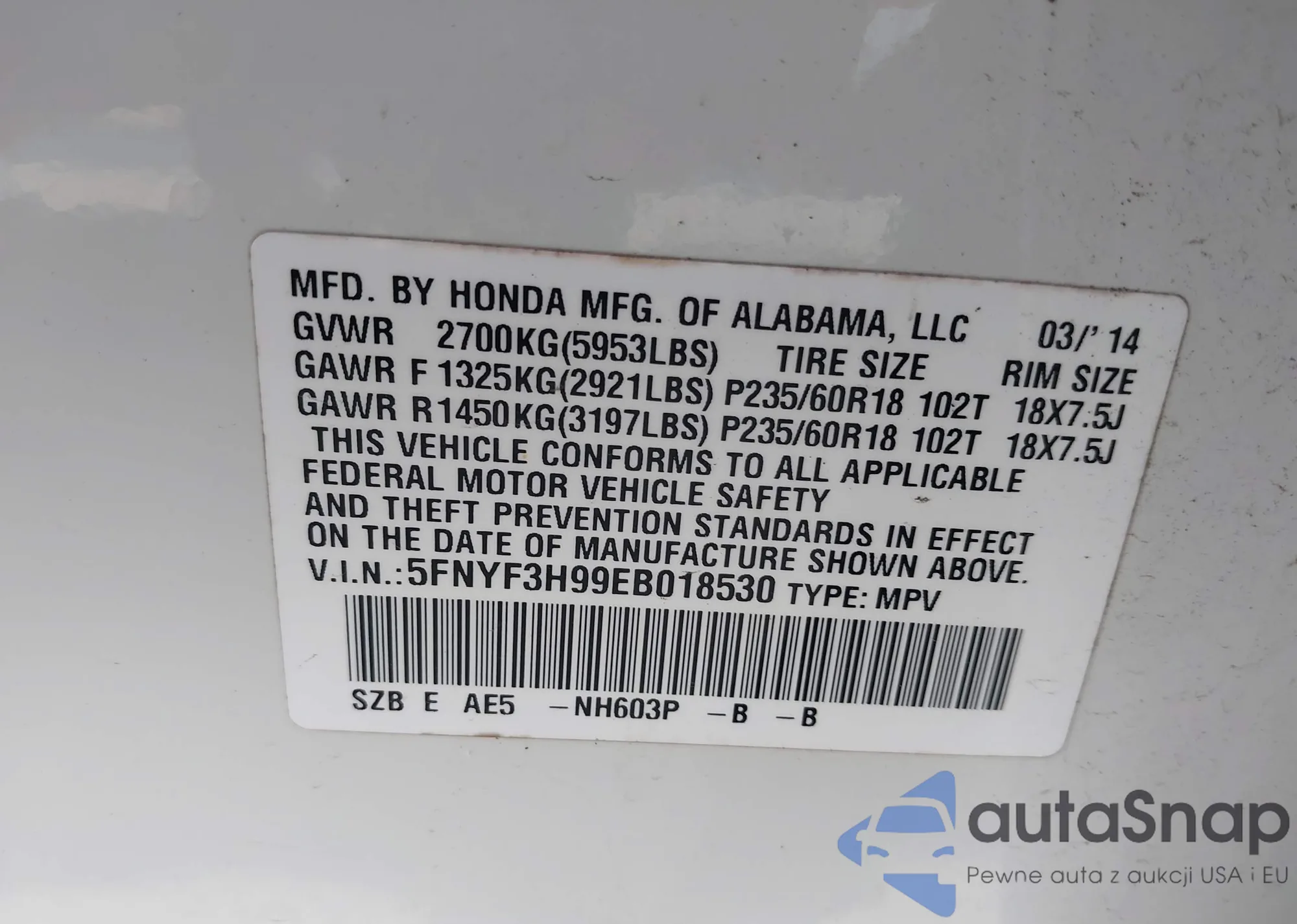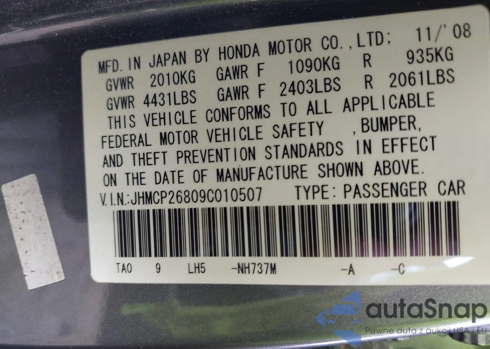 LOT: 42270469 VIN: JHMCP26809C010507