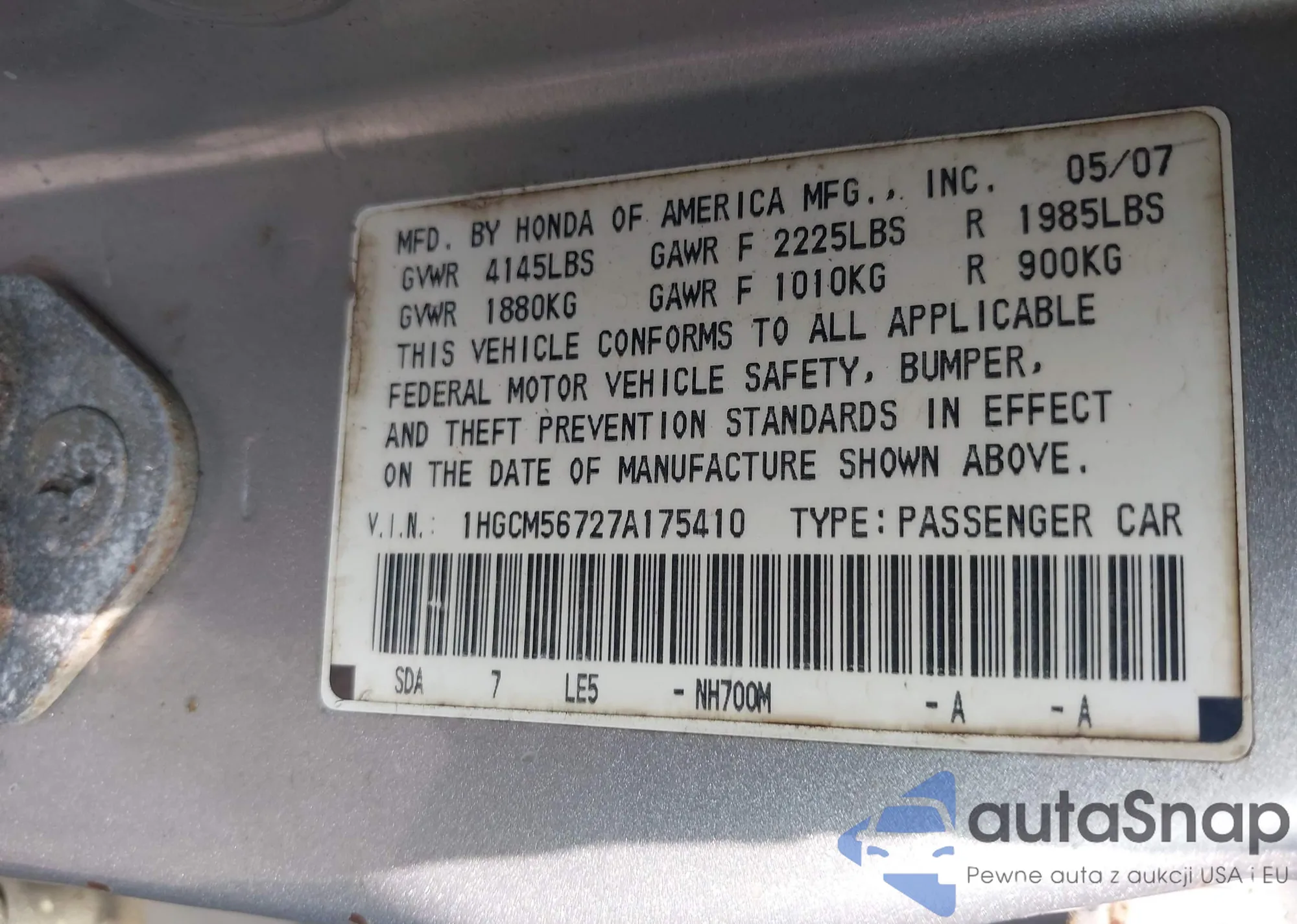 LOT: 42195867 VIN: 1HGCM56727A175410