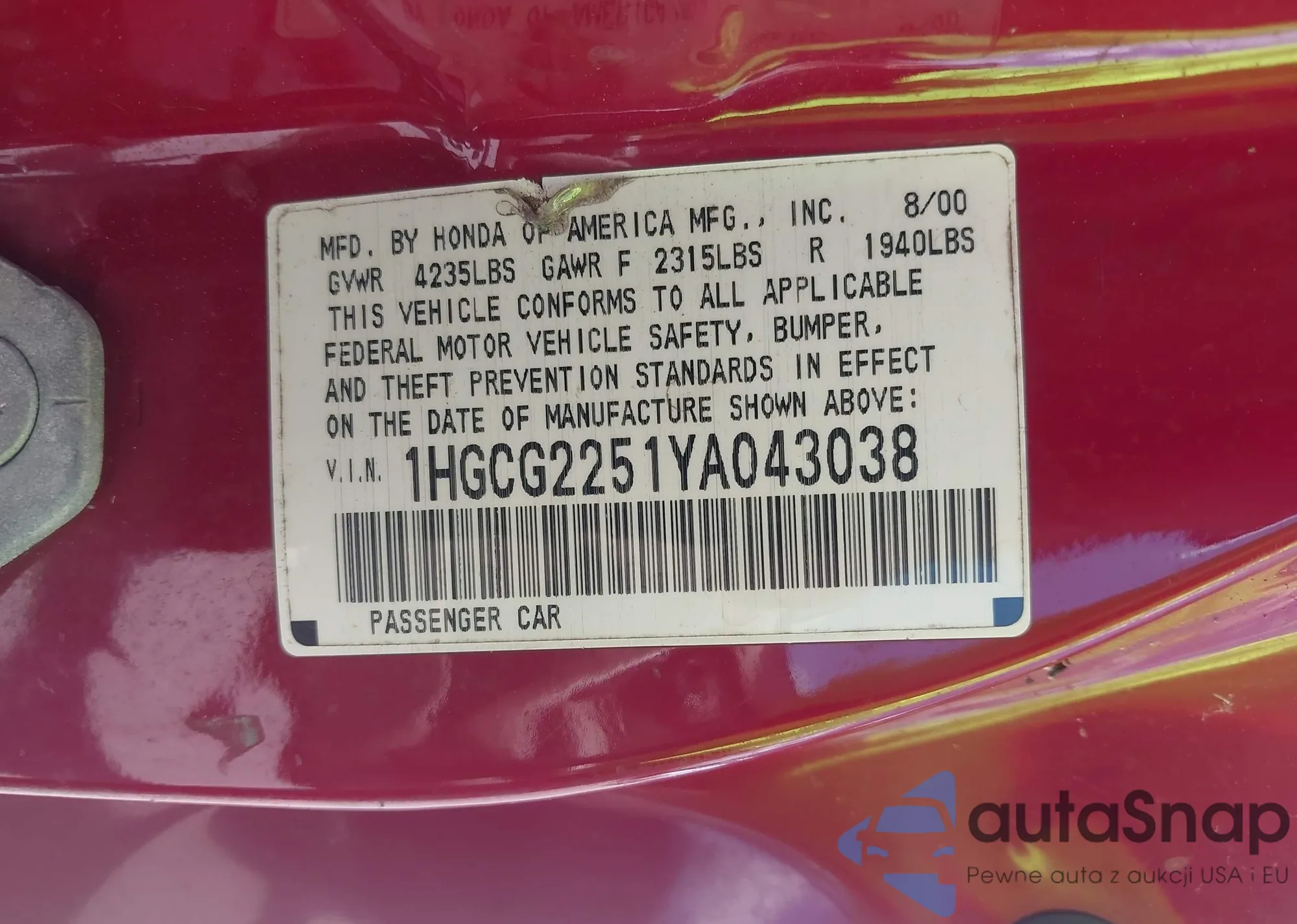 LOT: 42255312 VIN: 1HGCG2251YA043038