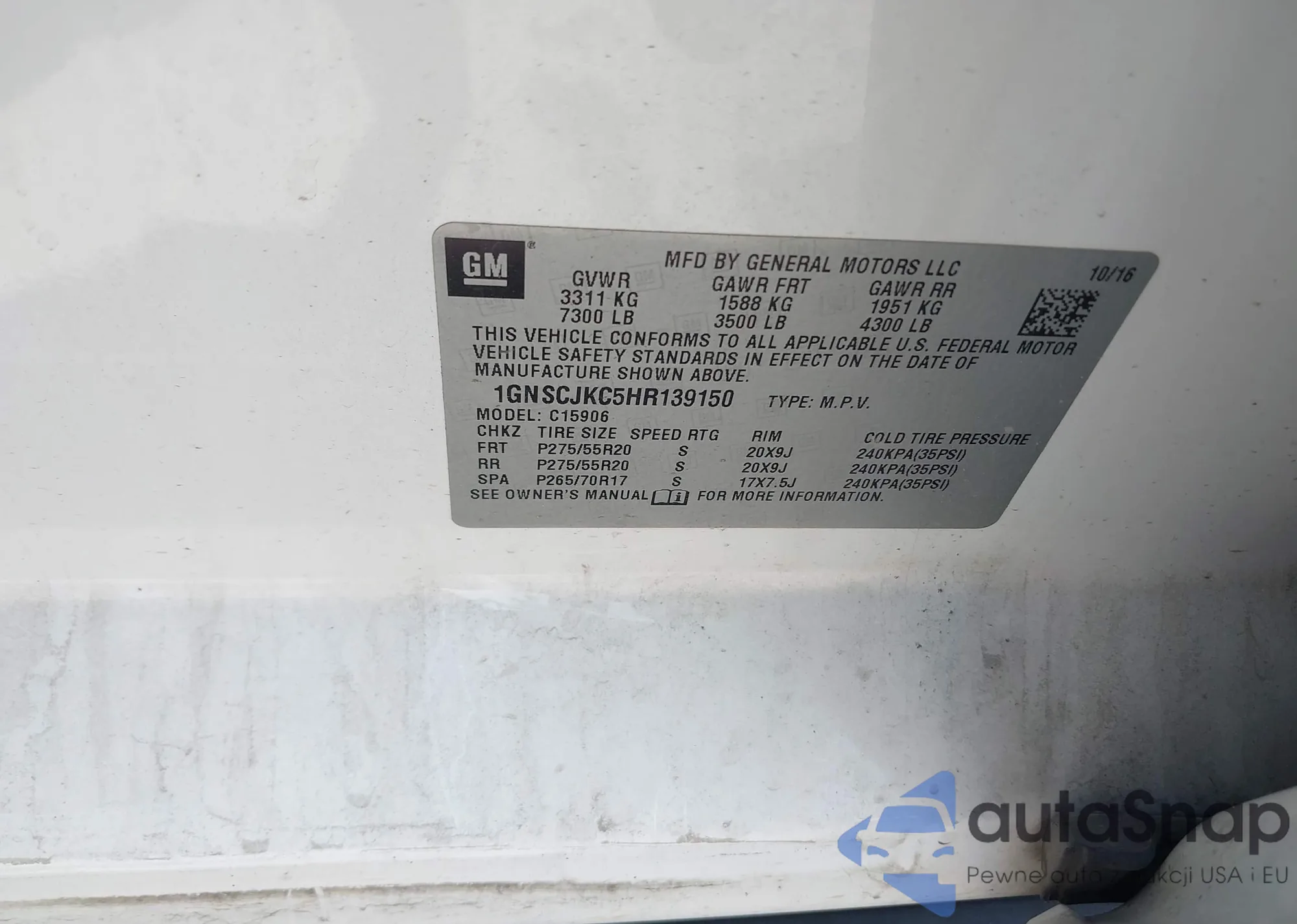 LOT: 42125570 VIN: 1GNSCJKC5HR139150