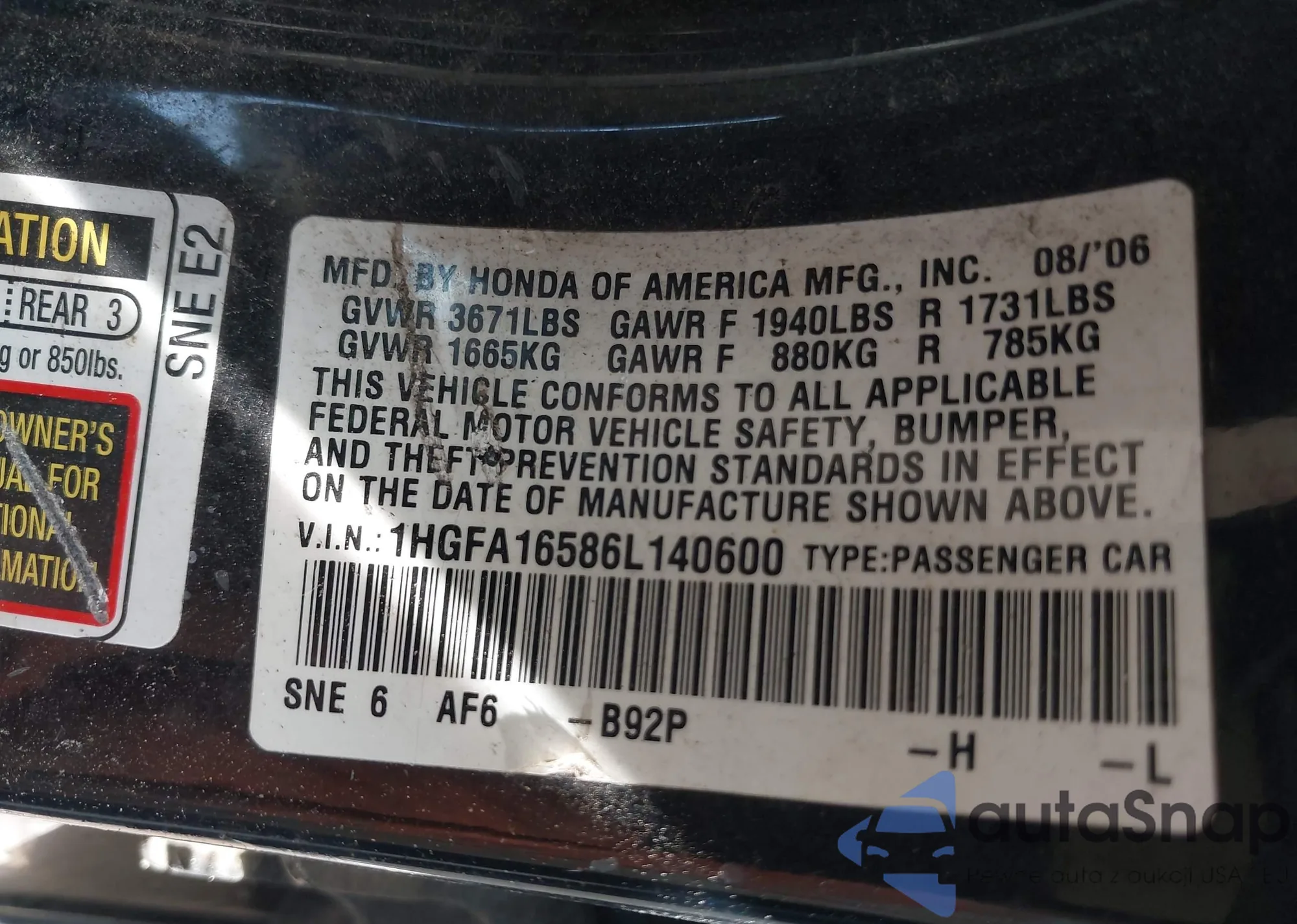 LOT: 42198775 VIN: 1HGFA16586L140600