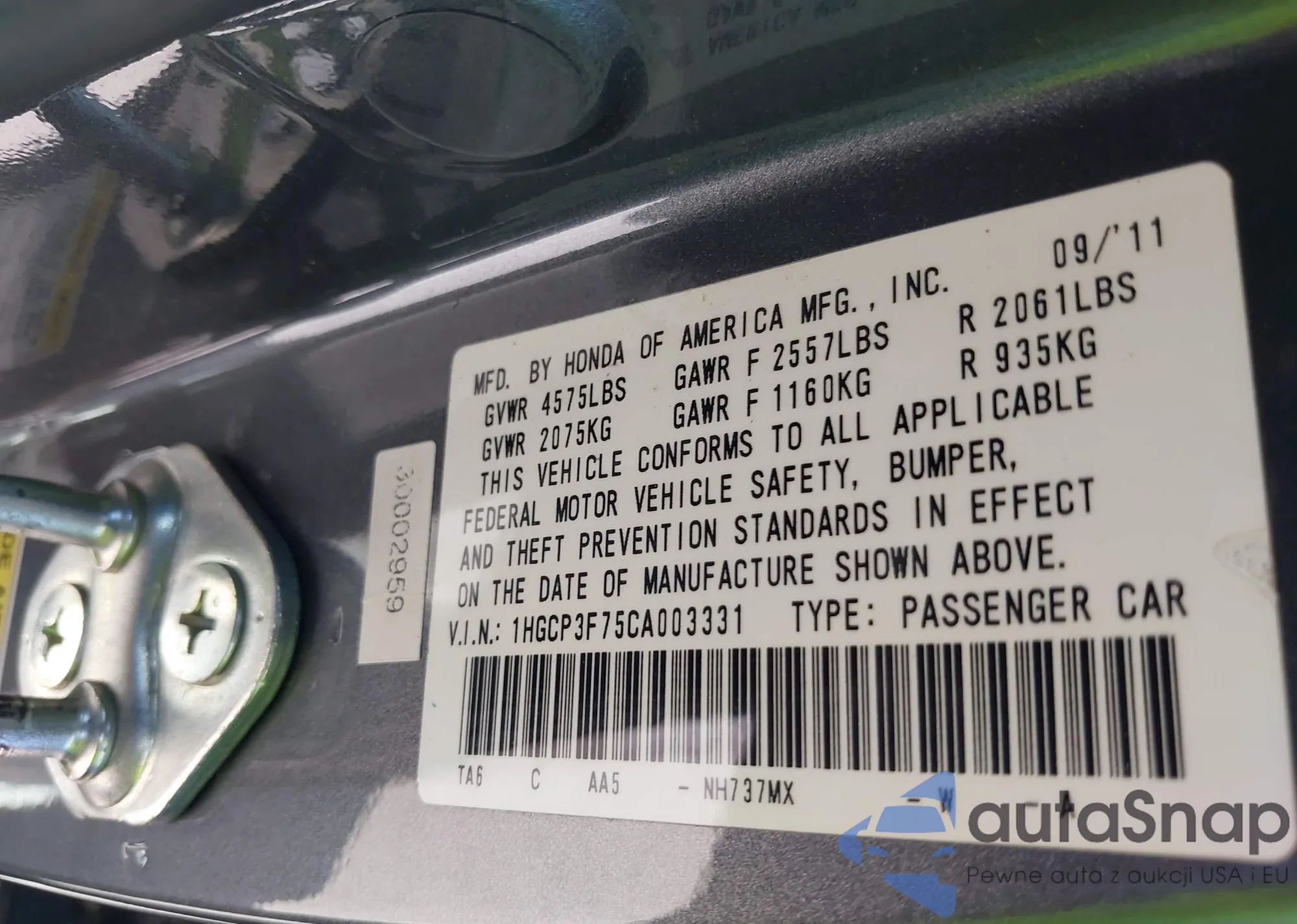 LOT: 42369592 VIN: 1HGCP3F75CA003331
