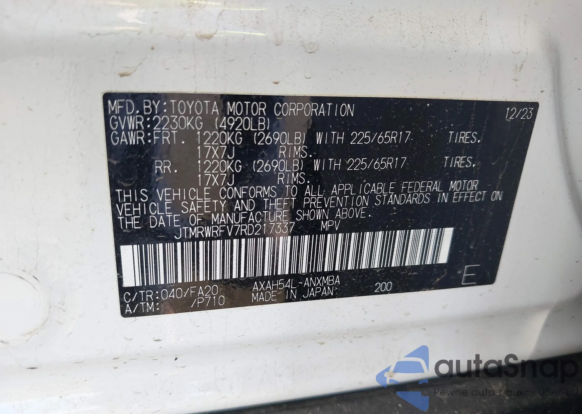 LOT: 42218321 VIN: JTMRWRFV7RD217337