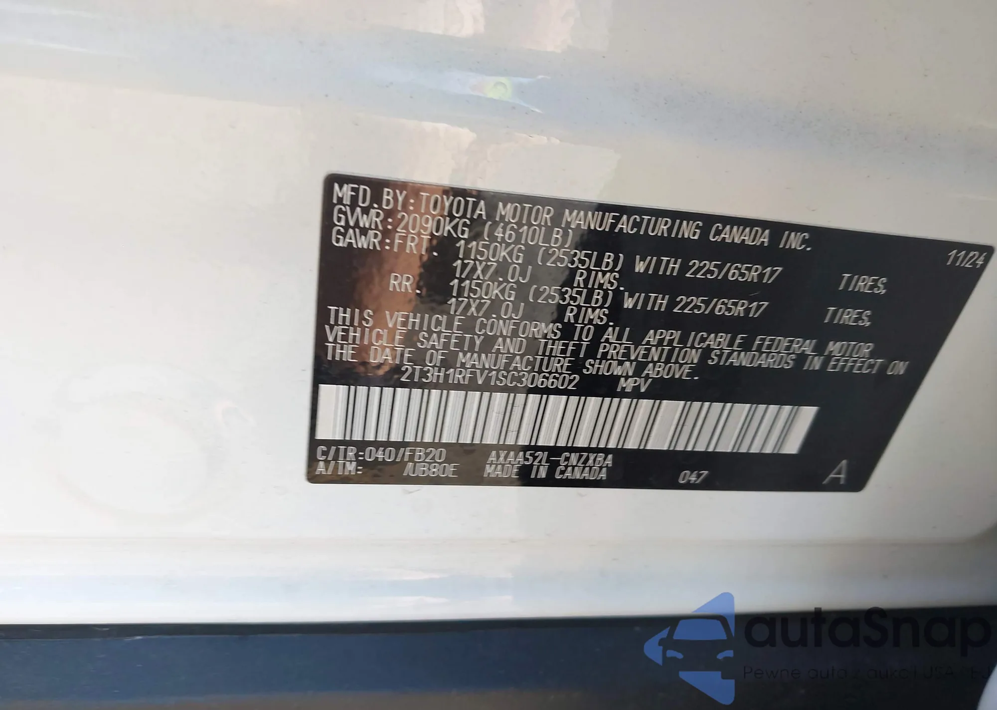 LOT: 42176580 VIN: 2T3H1RFV1SC306602