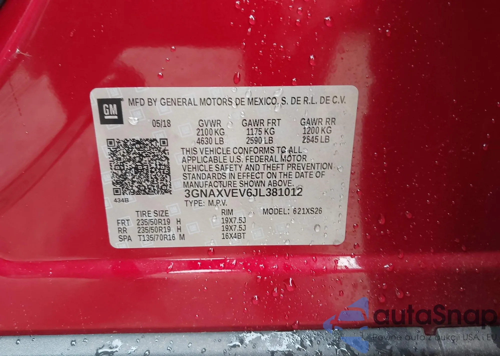 LOT: 42287501 VIN: 3GNAXVEV6JL381012