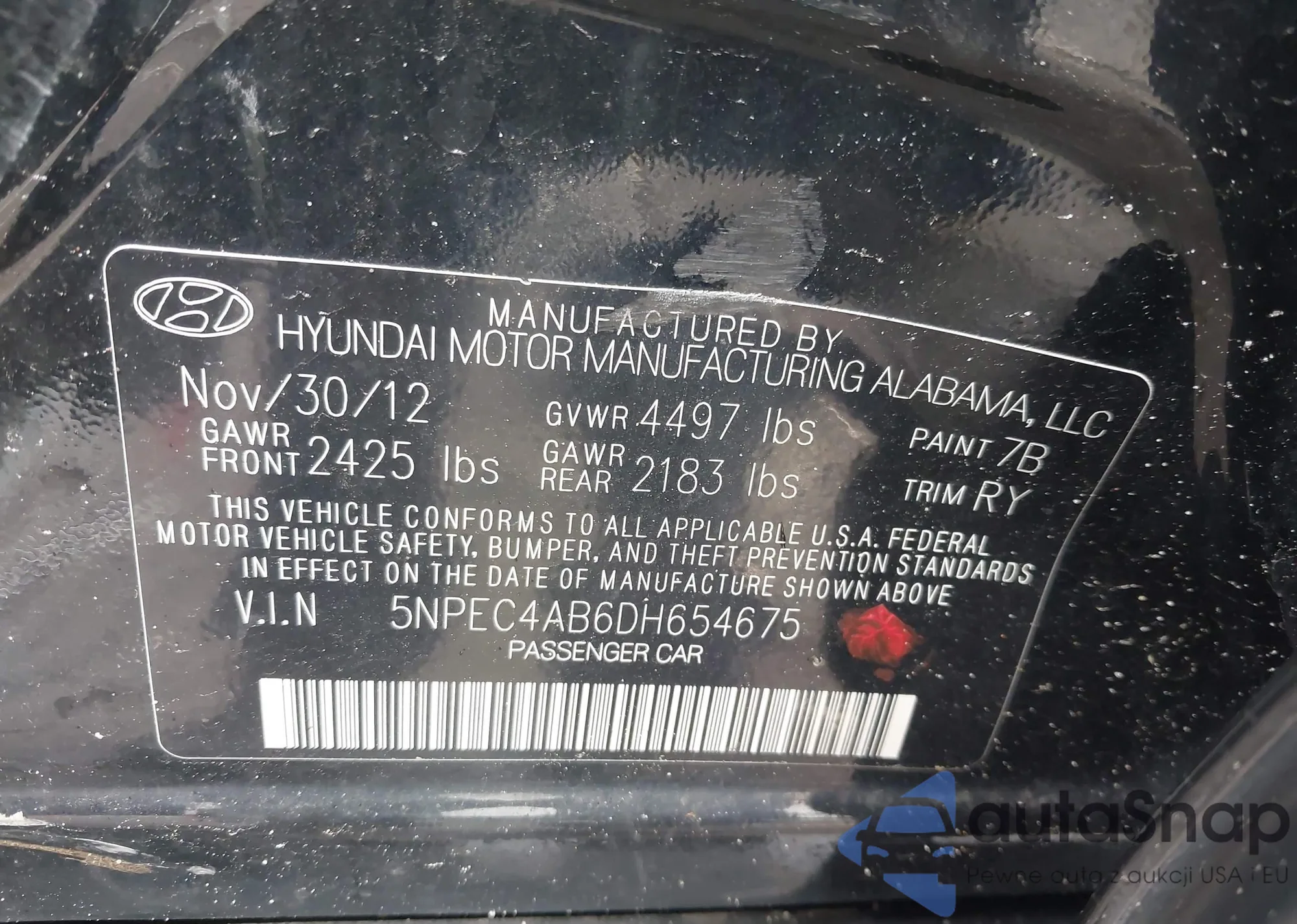 LOT: 42382287 VIN: KM8SM4HF7HU179649