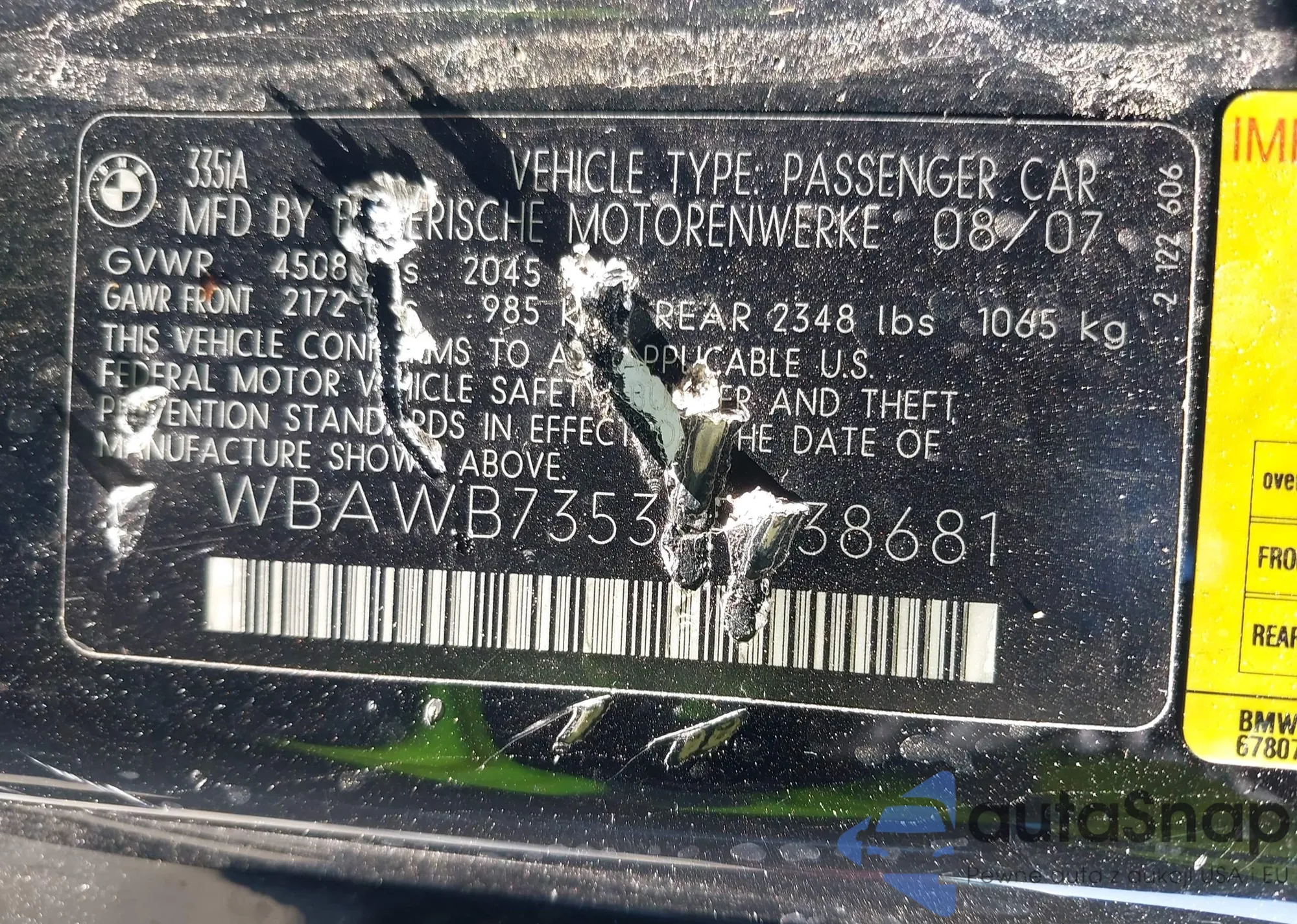2007 BMW 335I из США, поврежденный, VIN WBAWB73537P038681
