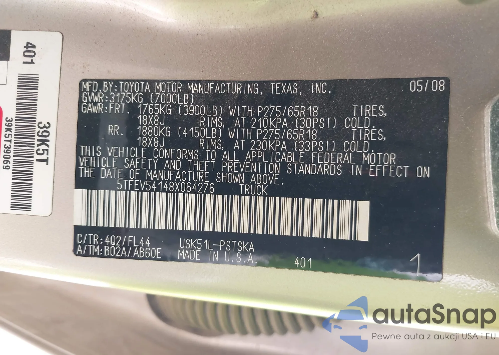 LOT: 41981752 VIN: 5TFEV54148X064276
