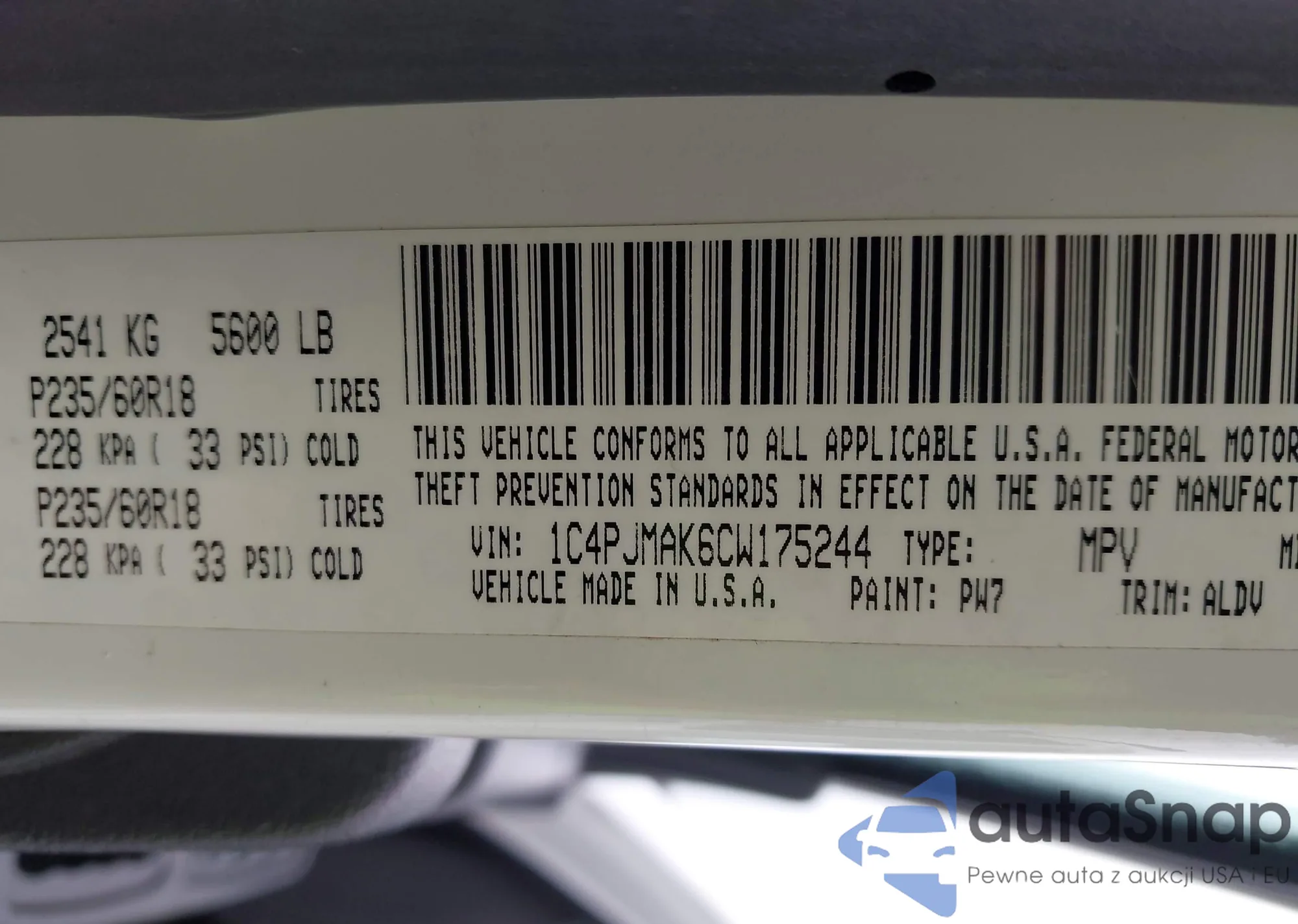 • VIN 1C4PJMAK6CW175244