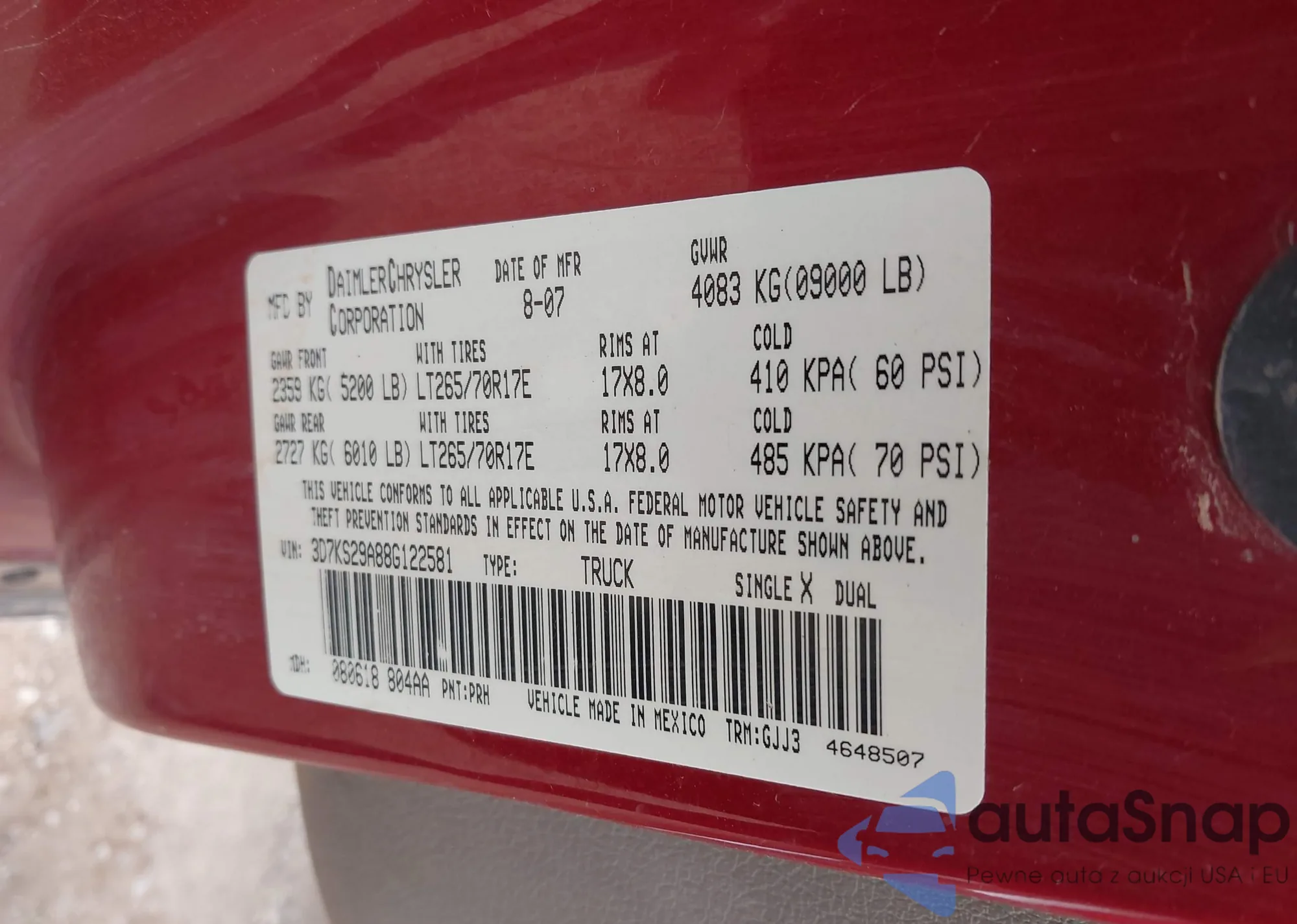 • VIN 3D7KS29A88G122581