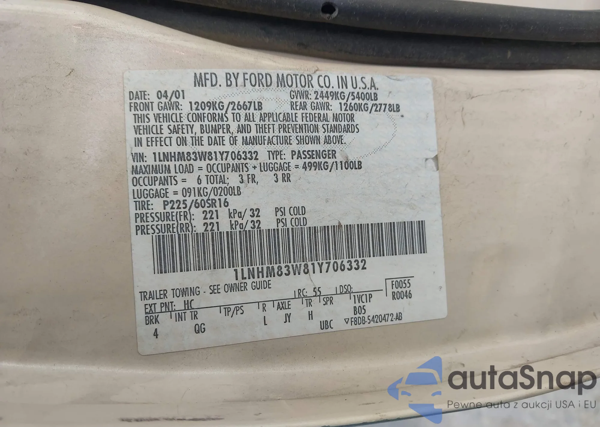 LOT: 42125002 VIN: 1LNHM83W81Y706332