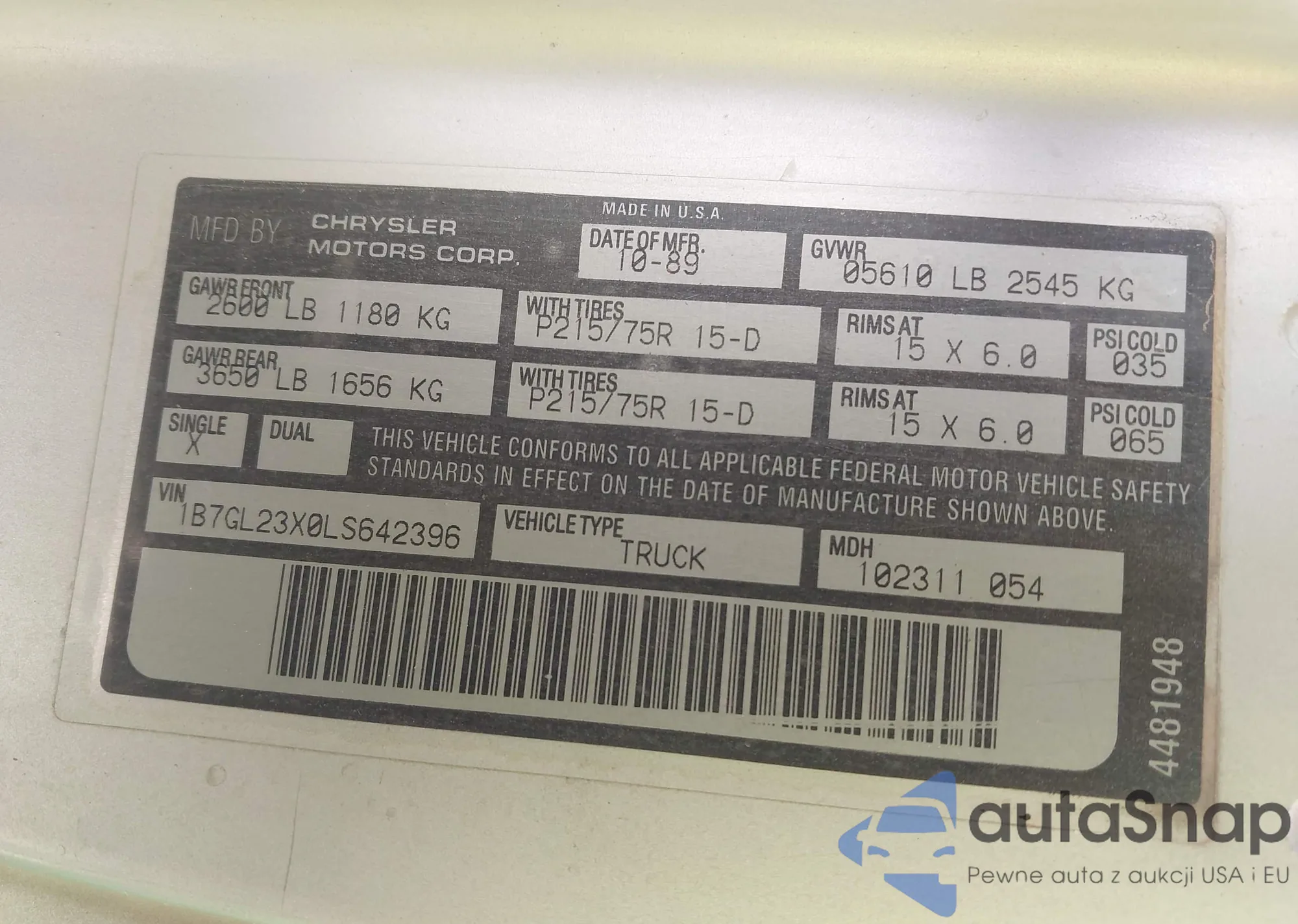 • VIN 1B7GL23X0LS642396