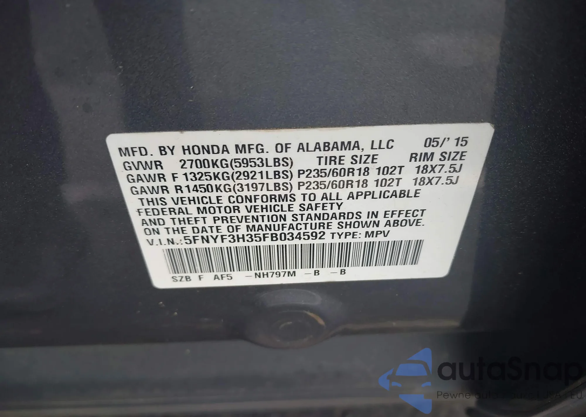 LOT: 42133579 VIN: 5FNYF3H35FB034592