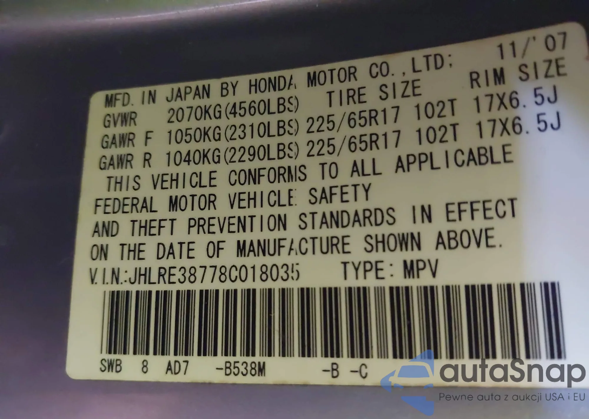 • VIN JHLRE38778C018035