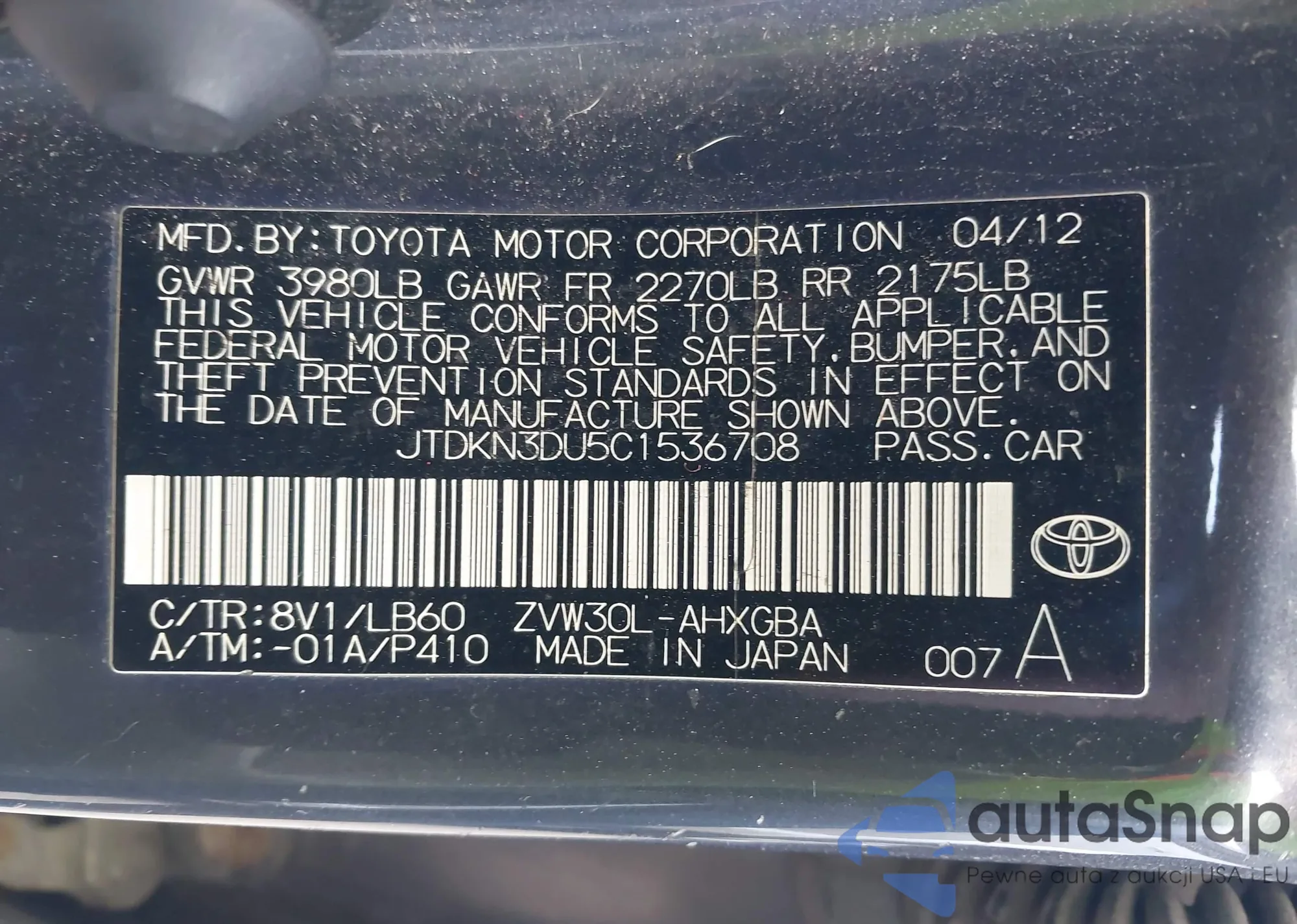 LOT: 42409618 VIN: JTDKN3DU5C1536708