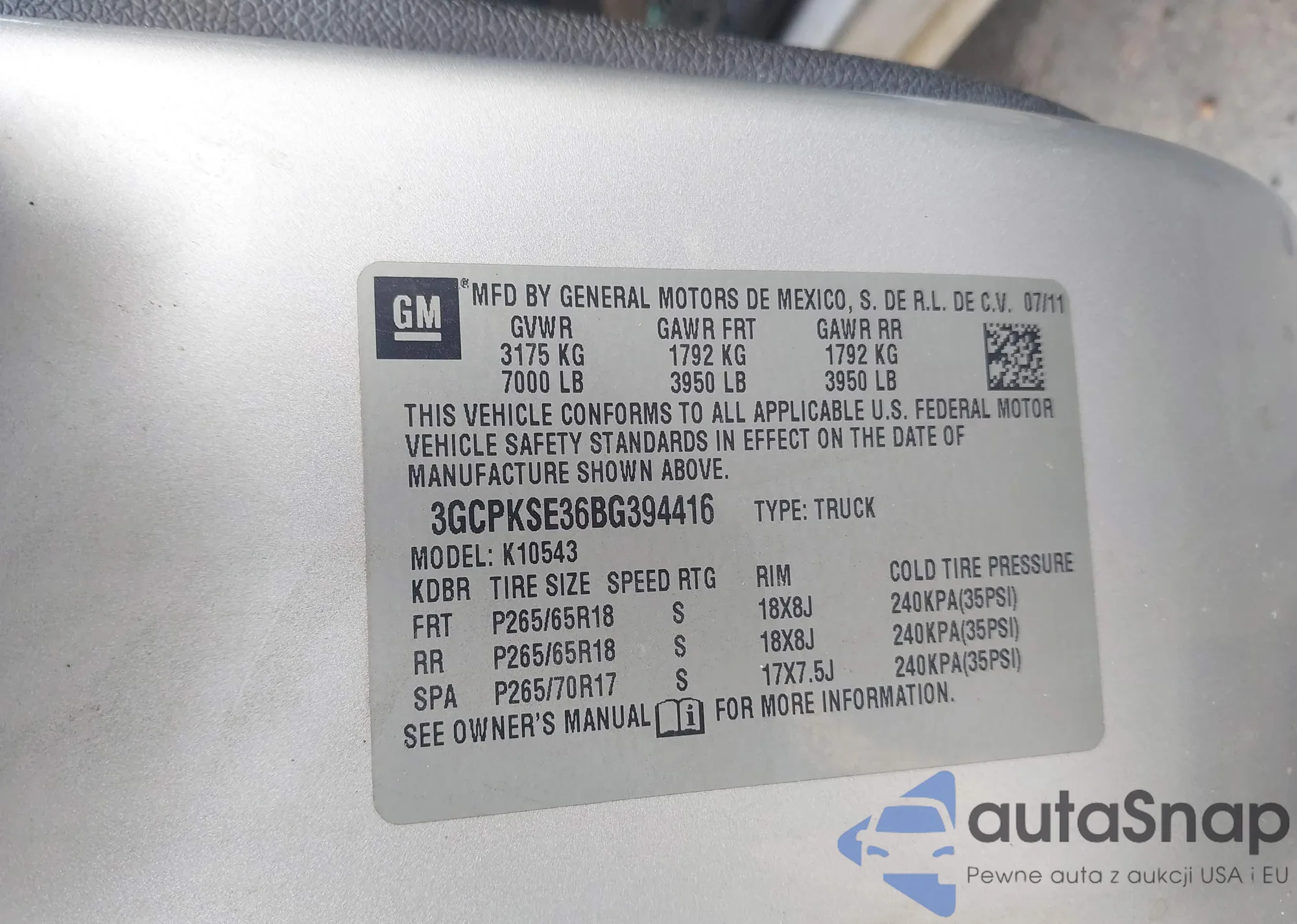 • VIN 3GCPKSE36BG394416