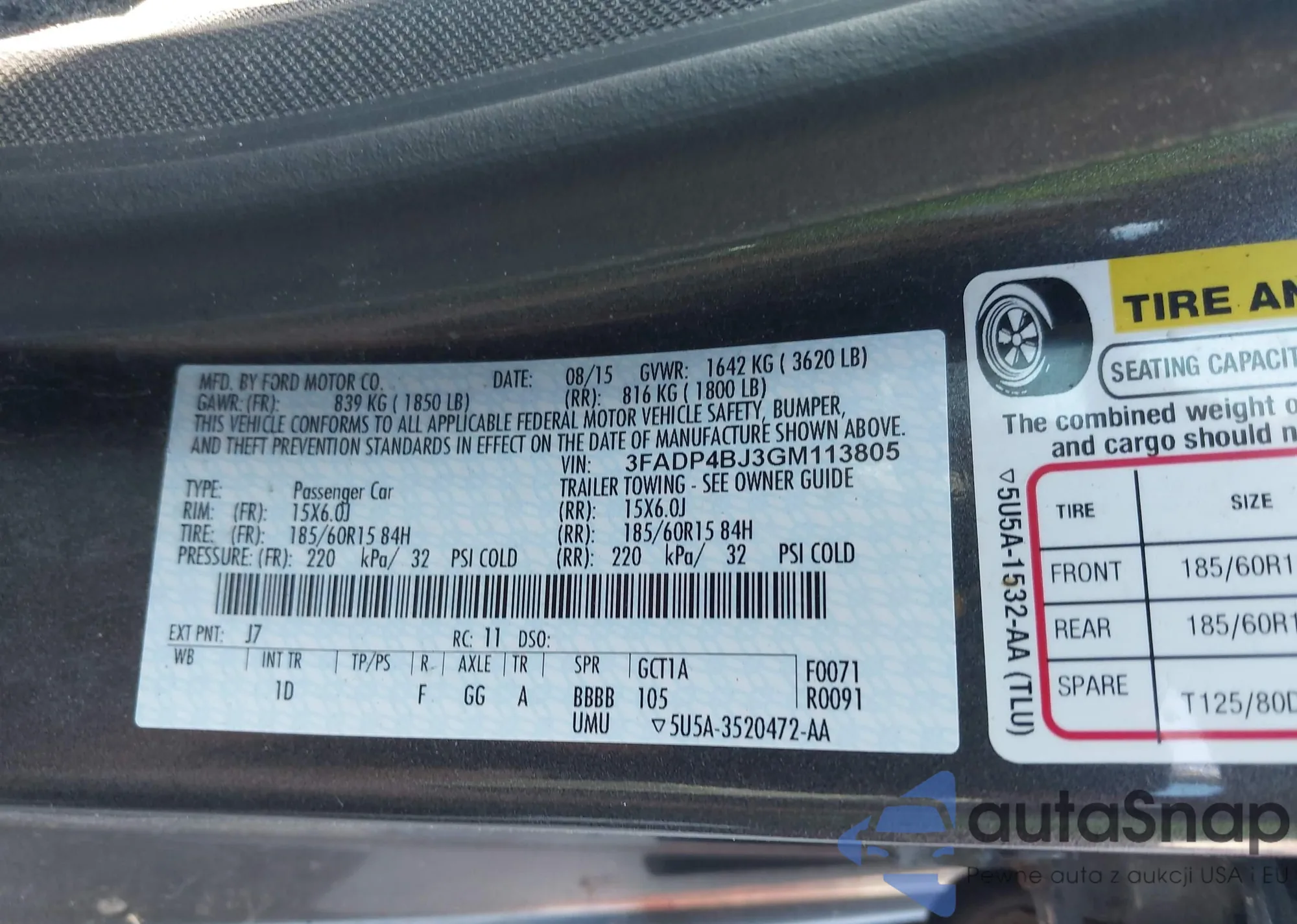 LOT: 42280502 VIN: 3FADP4BJ3GM113805