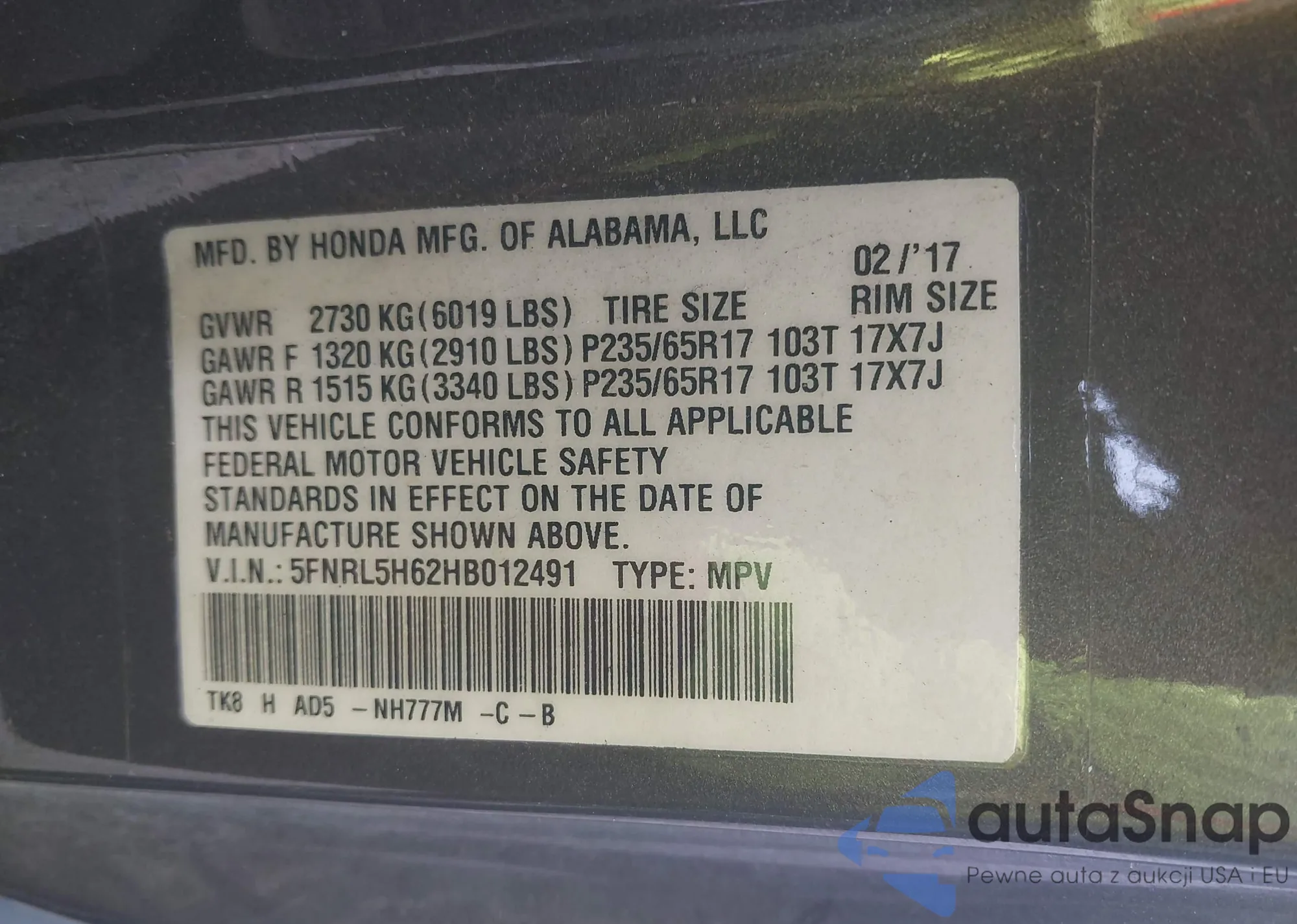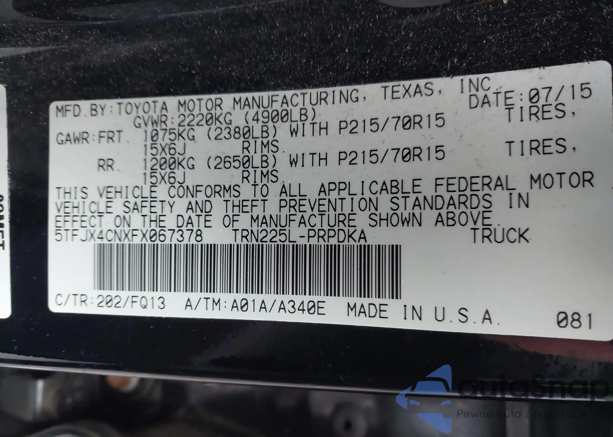 • VIN 5TFJX4CNXFX067378
