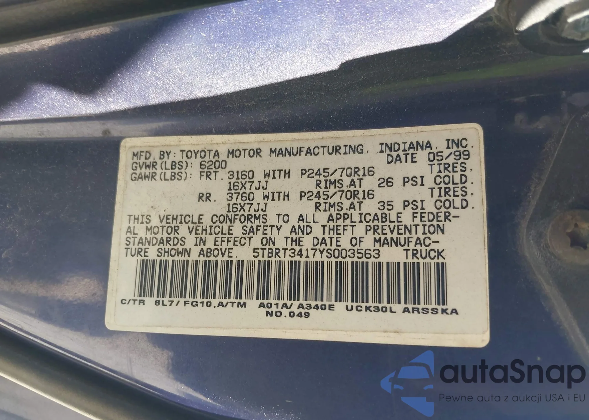 LOT: 42281071 VIN: 5TBRT3417YS003563