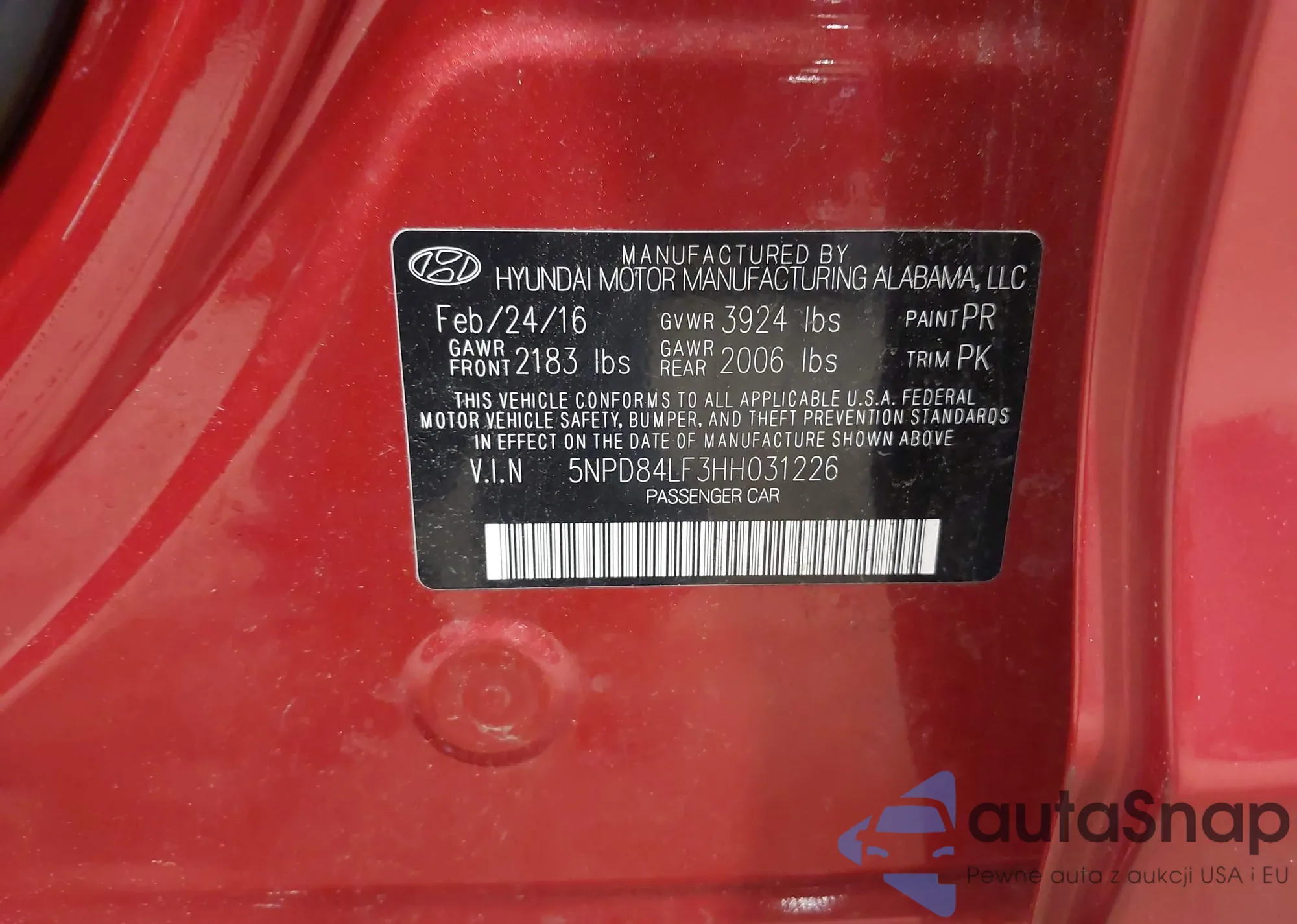 • VIN 5XYZU3LA6DG106616