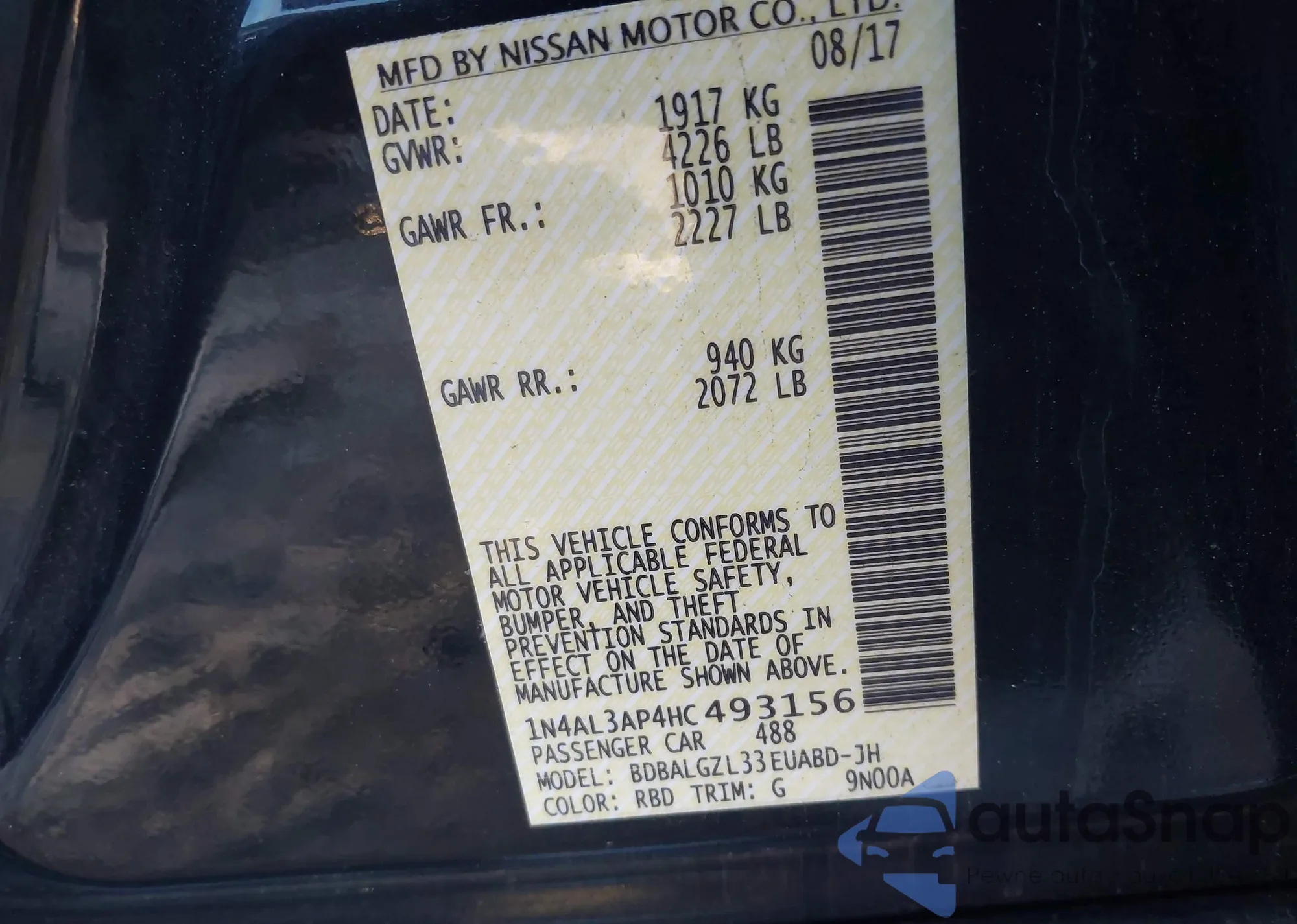 • VIN 1N4AL3AP4HC493156