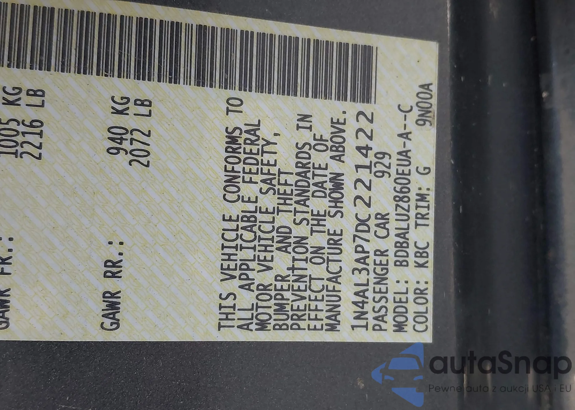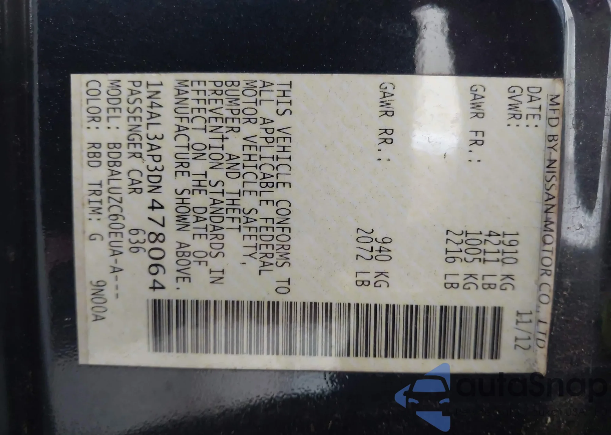 LOT: 42161673 VIN: 1N4AL3AP3DN478064