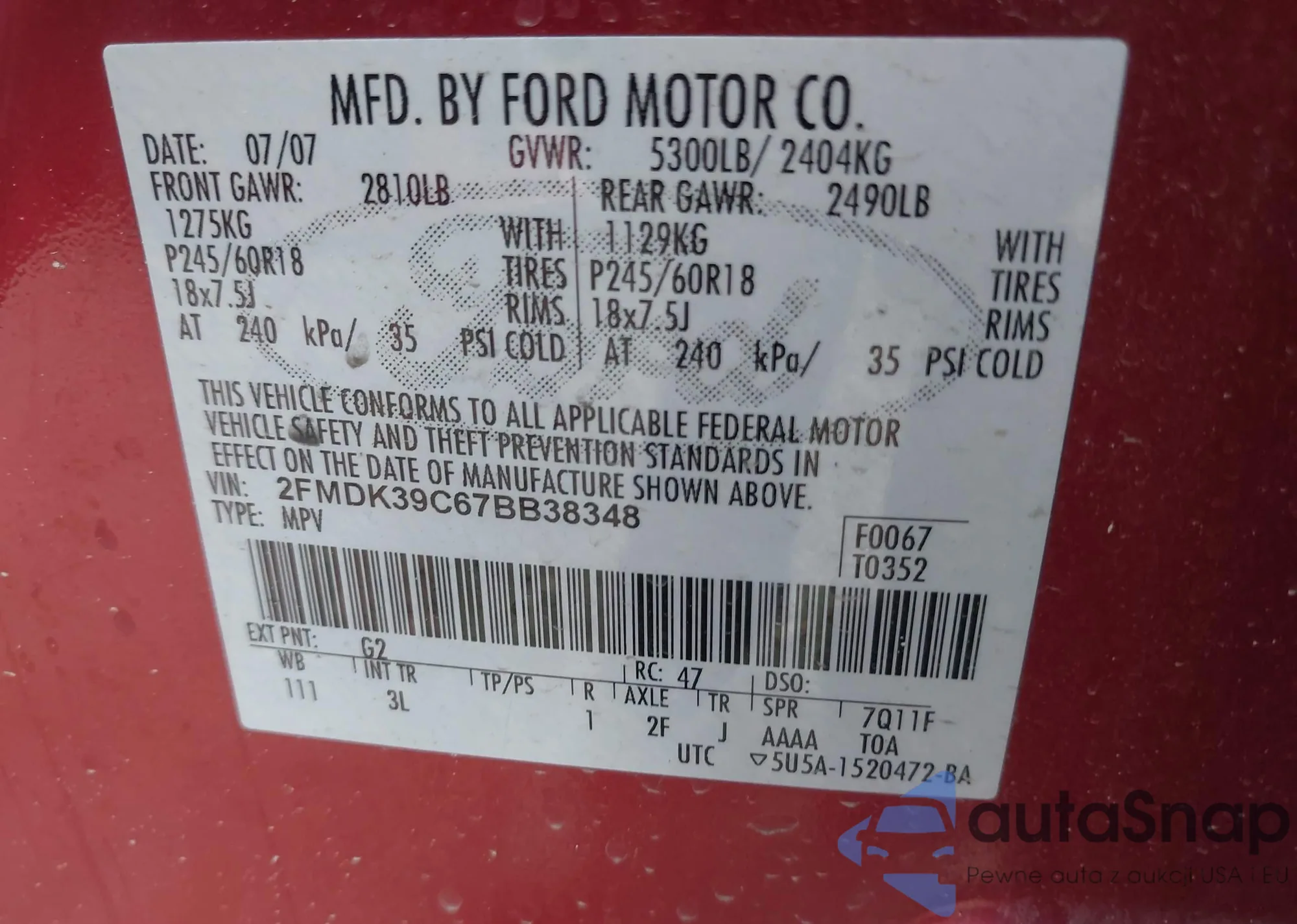 • VIN 2FMDK39C67BB38348