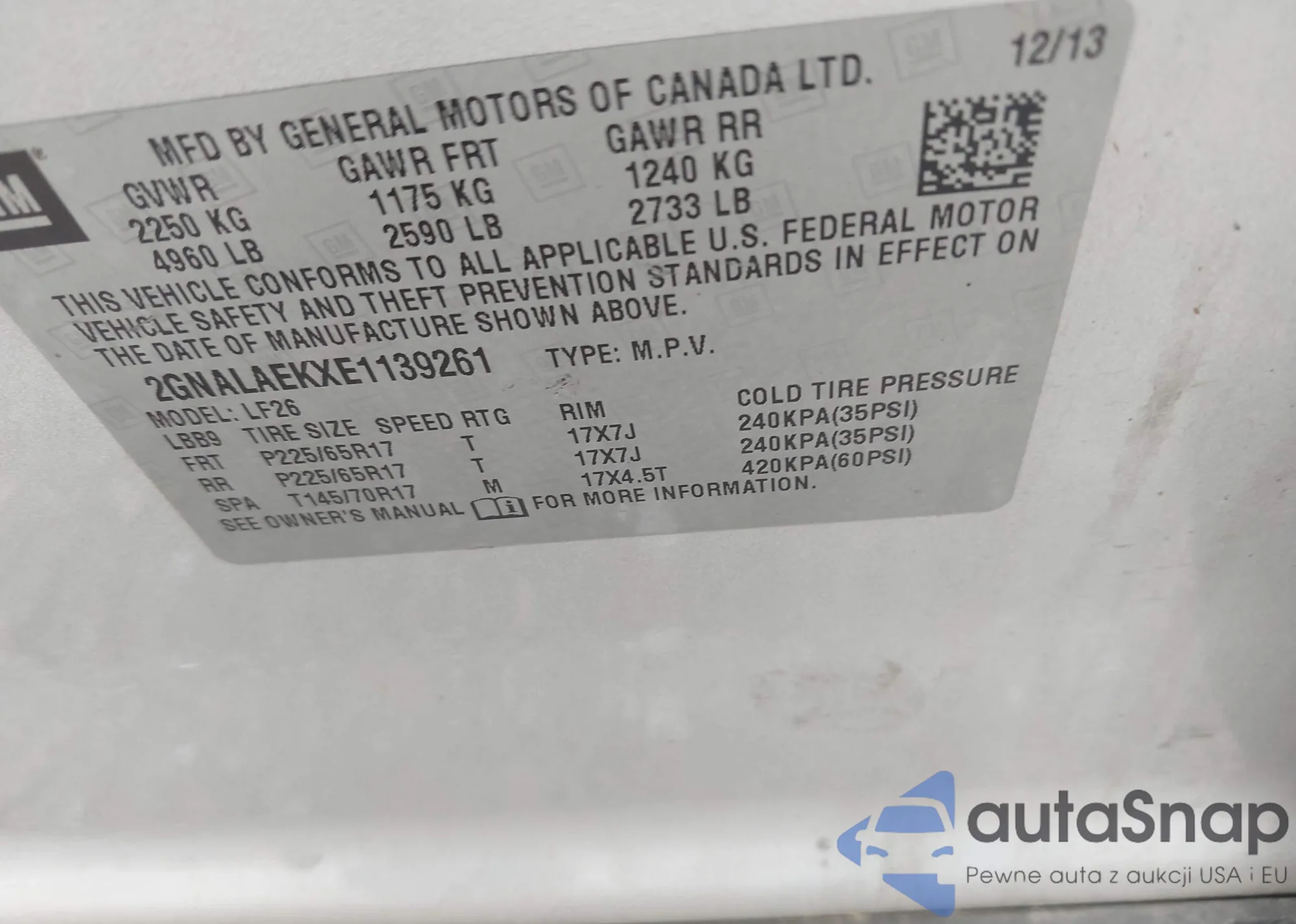 LOT: 42343204 VIN: 2GNALAEKXE1139261