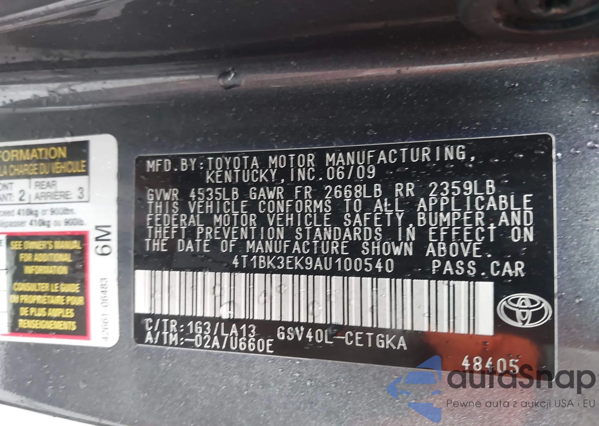 LOT: 42307538 VIN: 4T1BK3EK9AU100540