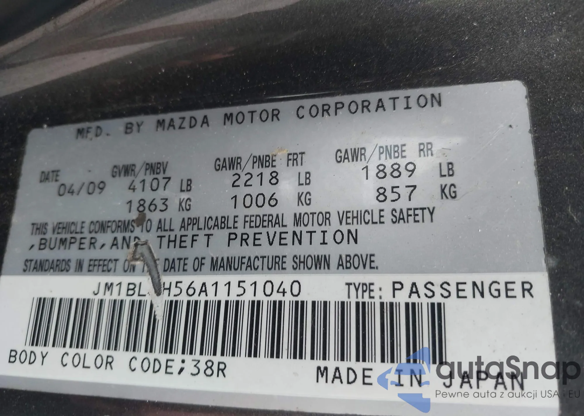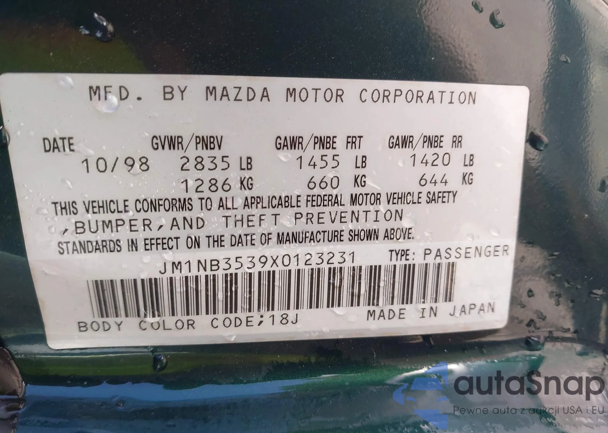 LOT: 42314156 VIN: JM1NB3539X0123231