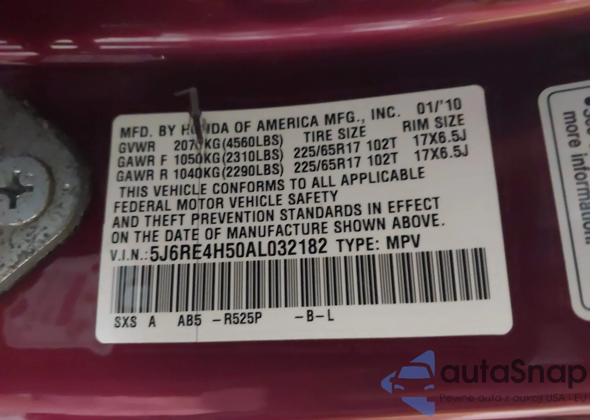 • VIN 5J6RE4H50AL032182